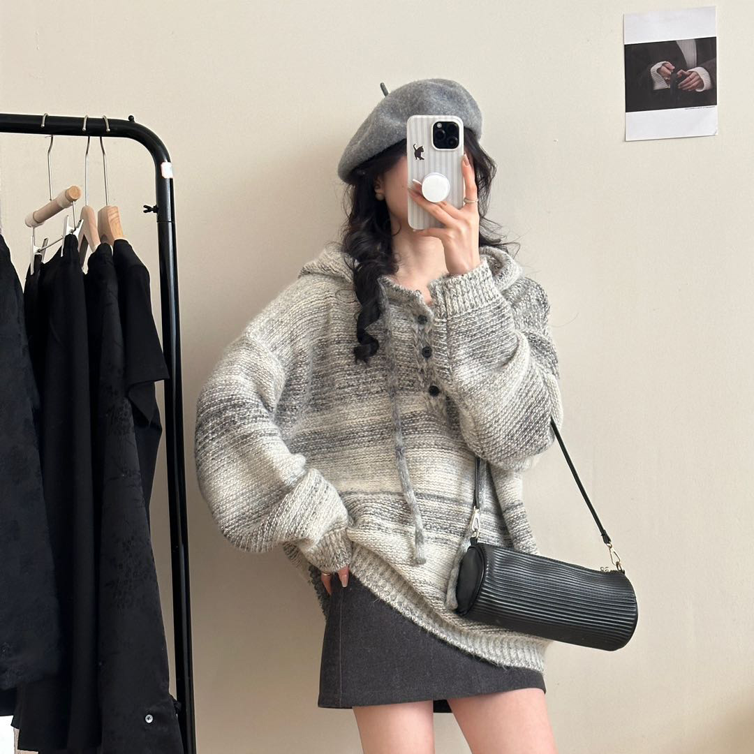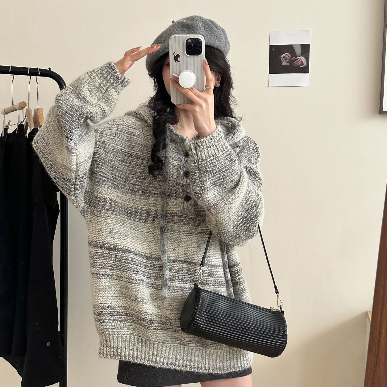 美式潮牌懒惰风中长款渐变色帽衫复古百搭针织衫秋冬毛衣外套韩系