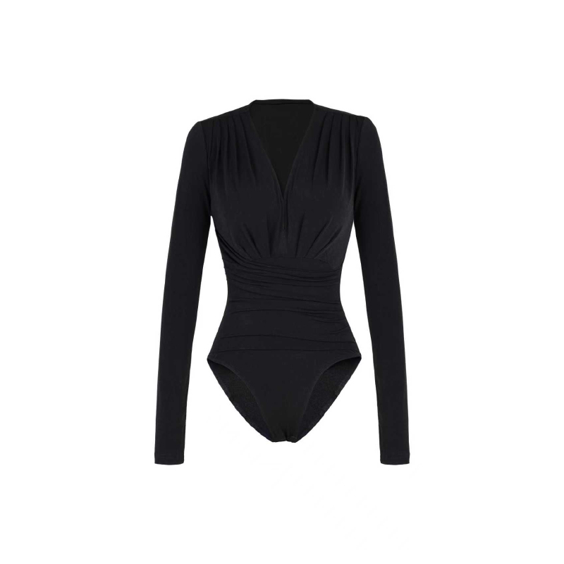 XULU原创秋季黑色弹力针织性感V领打底衫褶皱修身长袖连体上衣