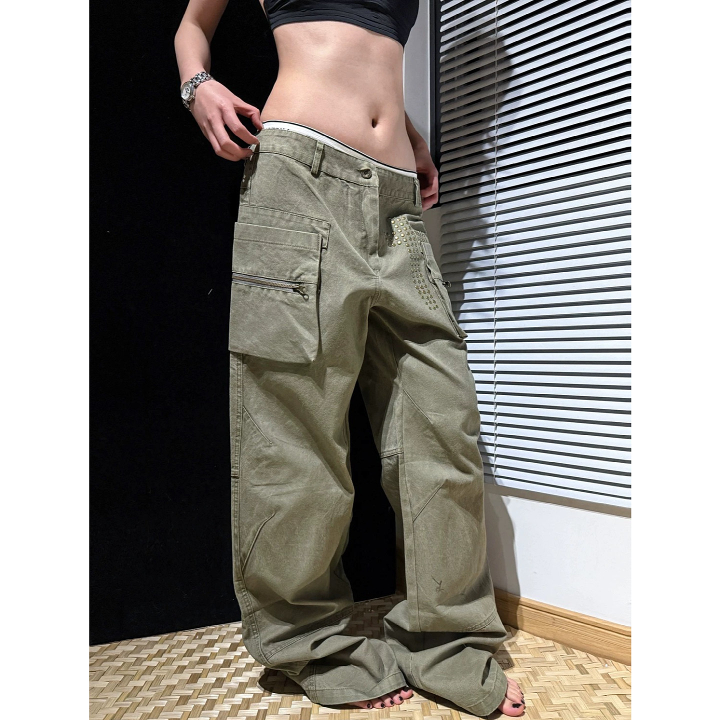 美式vibe复古街头大口袋铆钉绿色工装休闲裤男女高街宽松显瘦长裤
