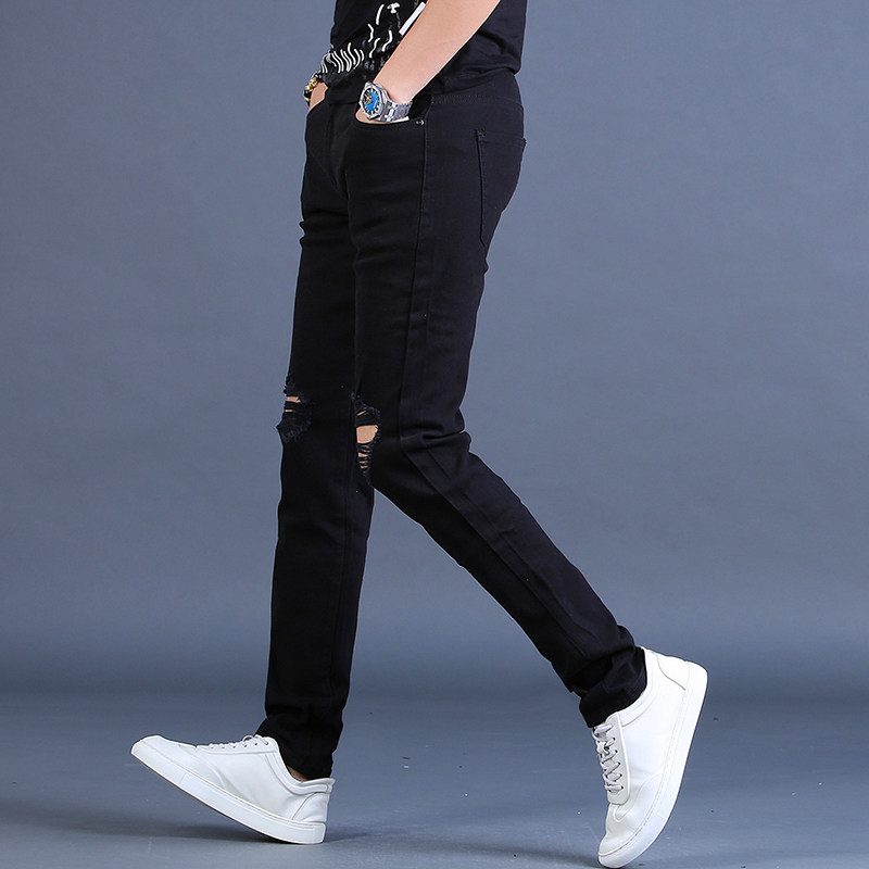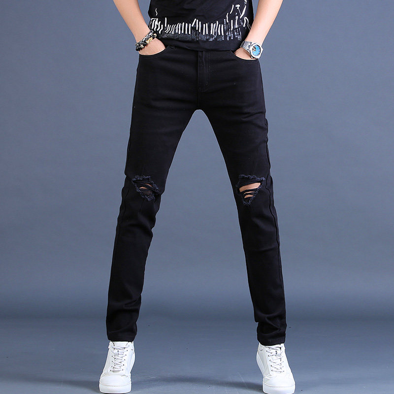 夏季薄款乞丐破洞黑色牛仔裤男修身小脚长裤休闲潮牌裤子韩版潮流