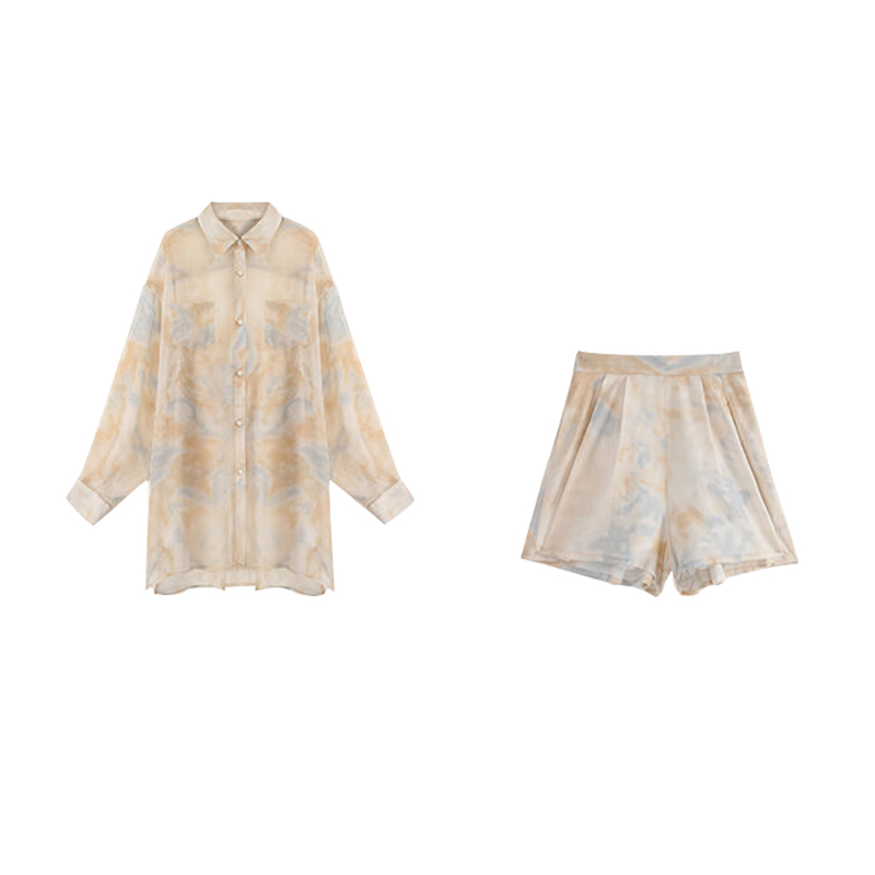 2024夏季新款两件套装女宽松长袖防晒衣衬衫阔腿短裤洋气两件套