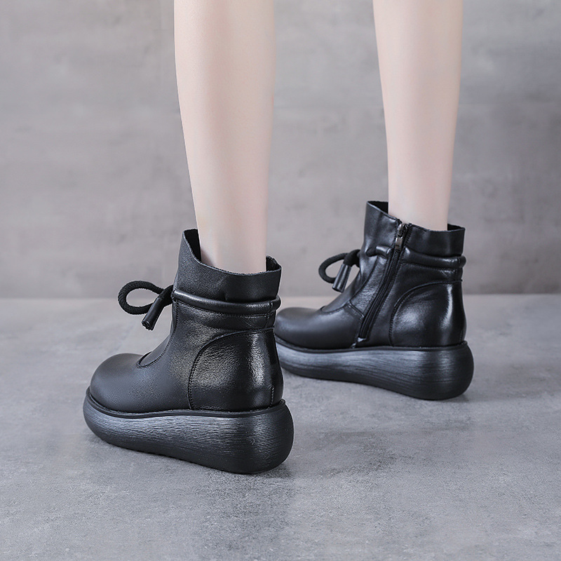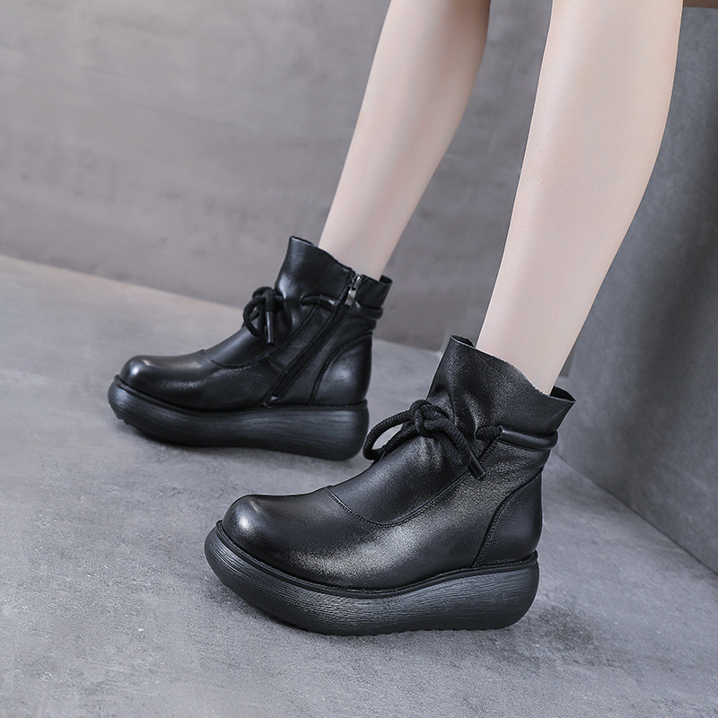 秋冬新款头层牛皮松糕跟短靴复古厚底真皮马丁靴百搭系带增高女鞋