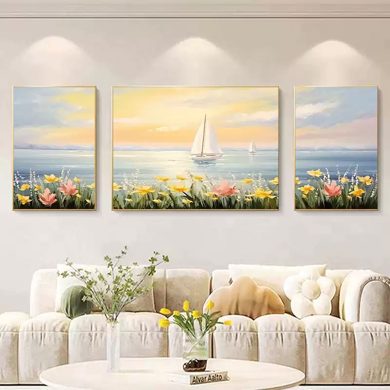 客厅装饰画简约沙发背景墙油画手绘轻奢一帆风顺挂画三联画抽象