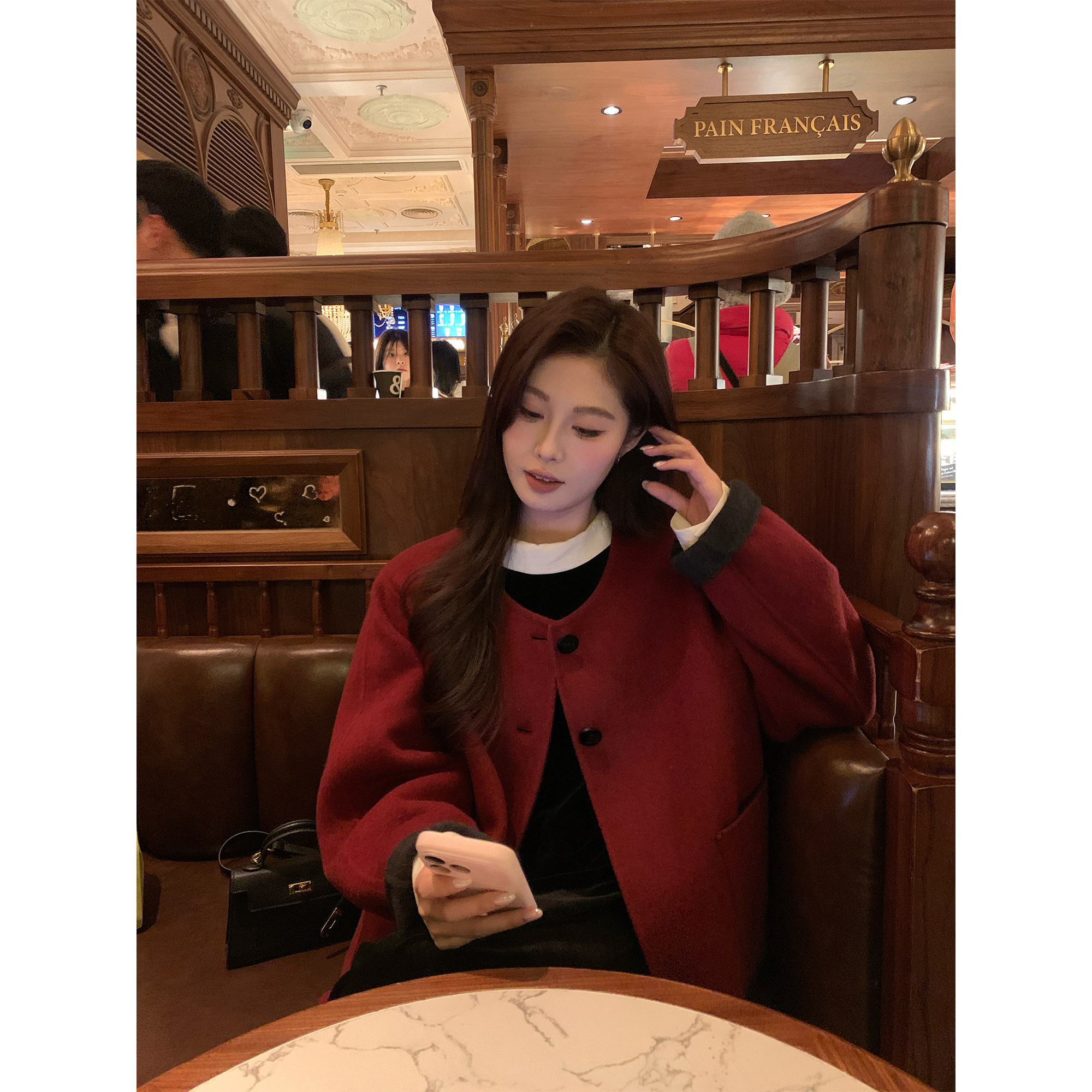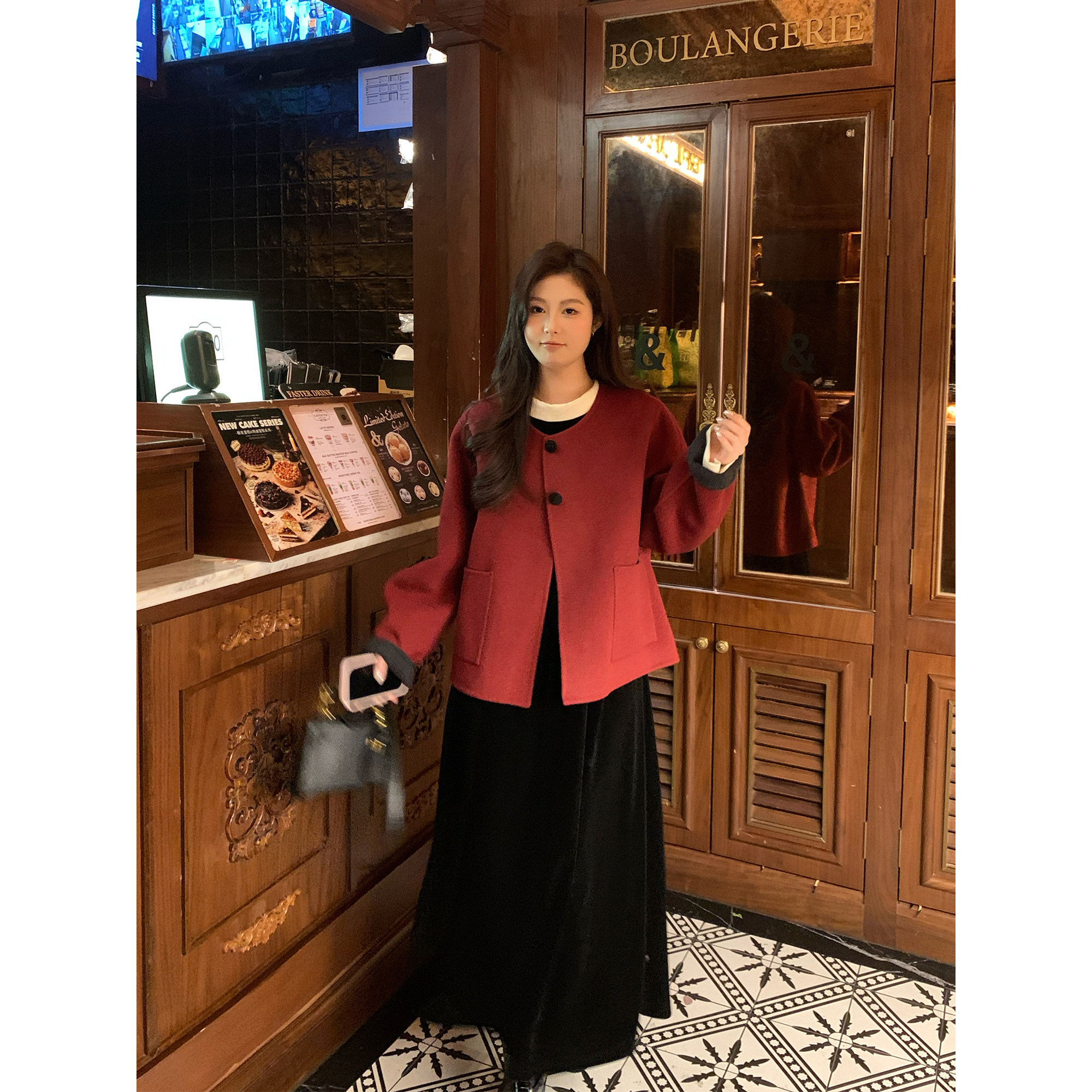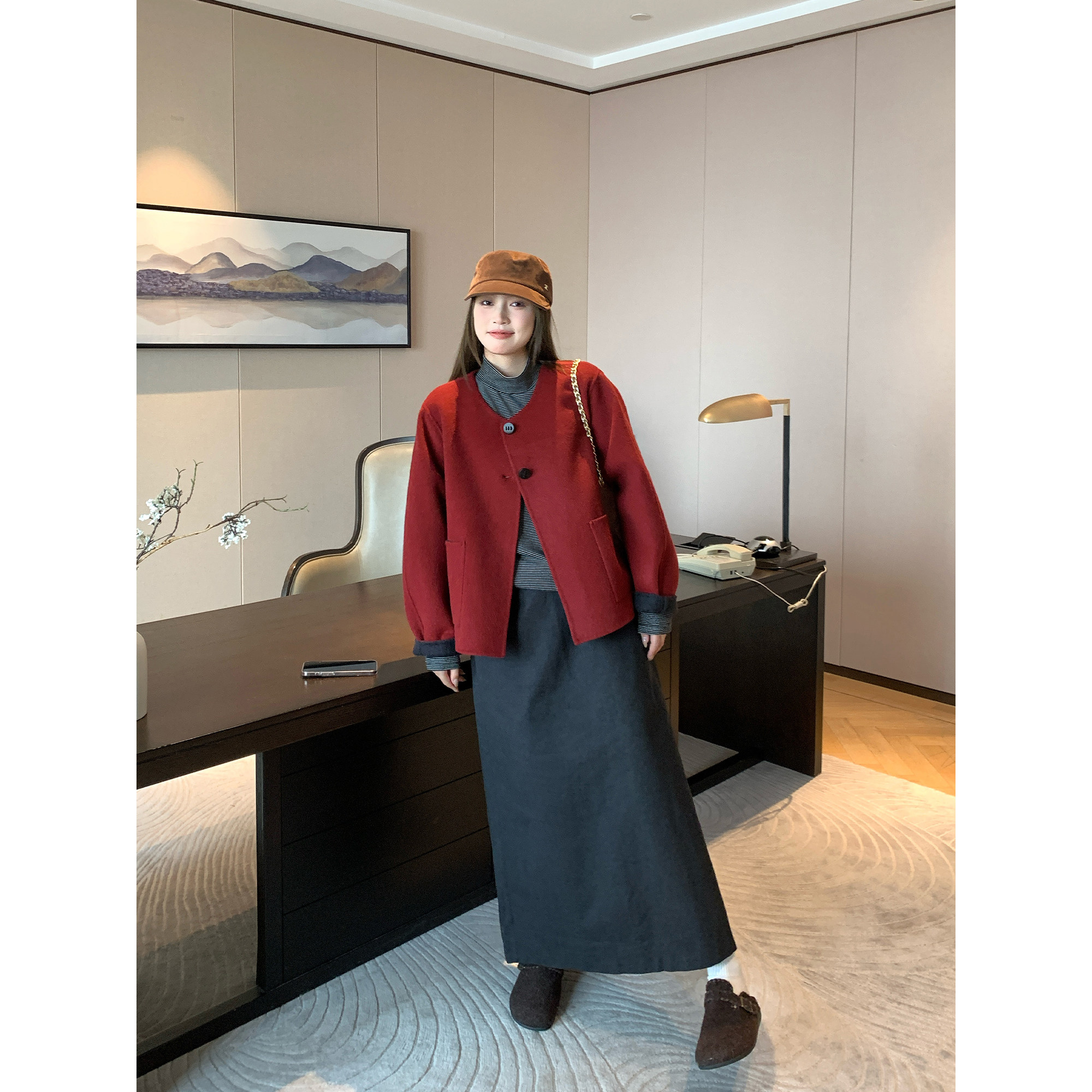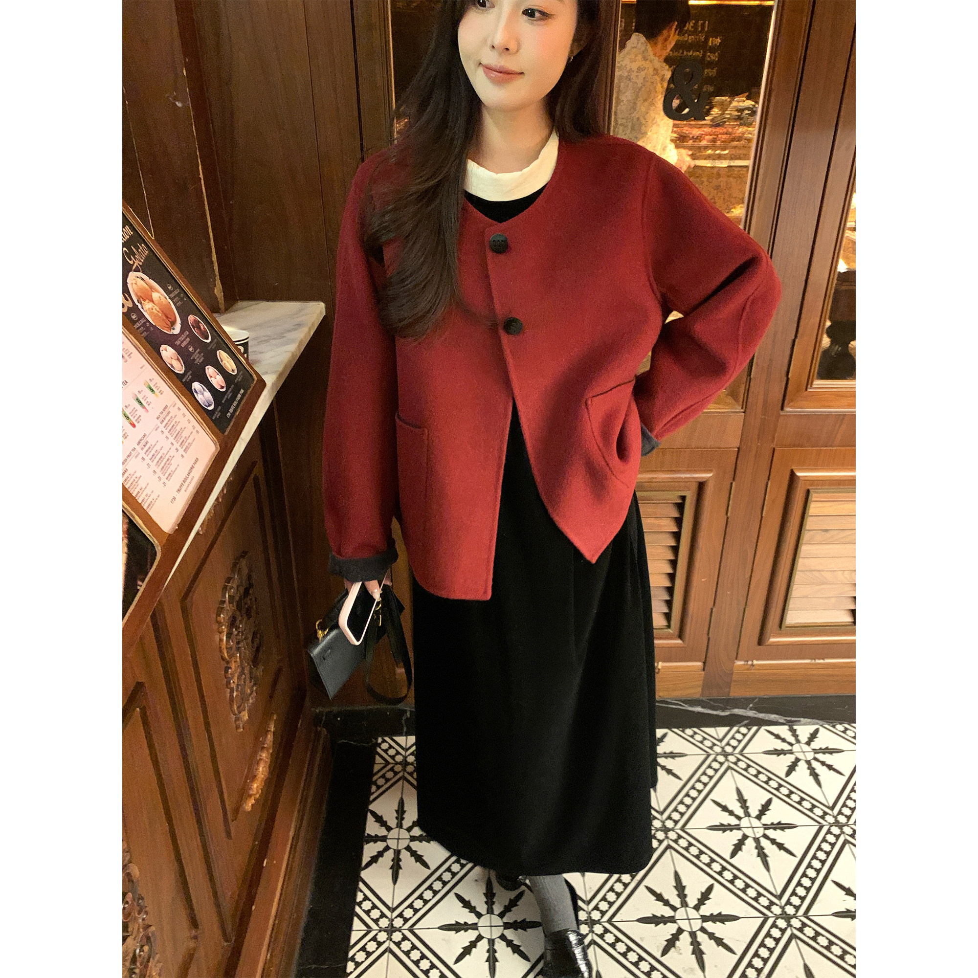 NAZ那子大码冬季新年朱砂红双面呢胖mm显瘦休闲气质短款毛呢外套