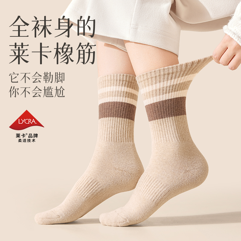 袜子女款保暖加绒加厚毛圈中筒袜秋冬季条纹美拉德棉袜防臭加长袜