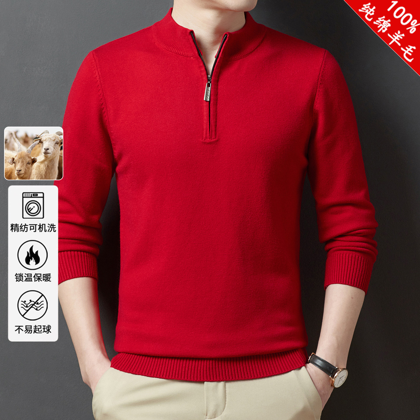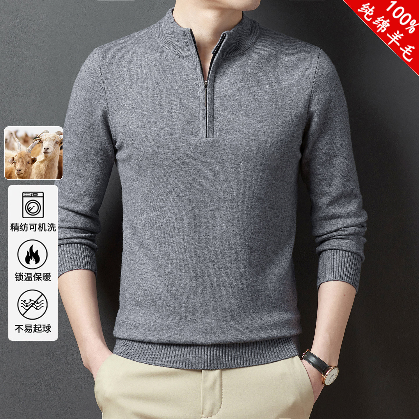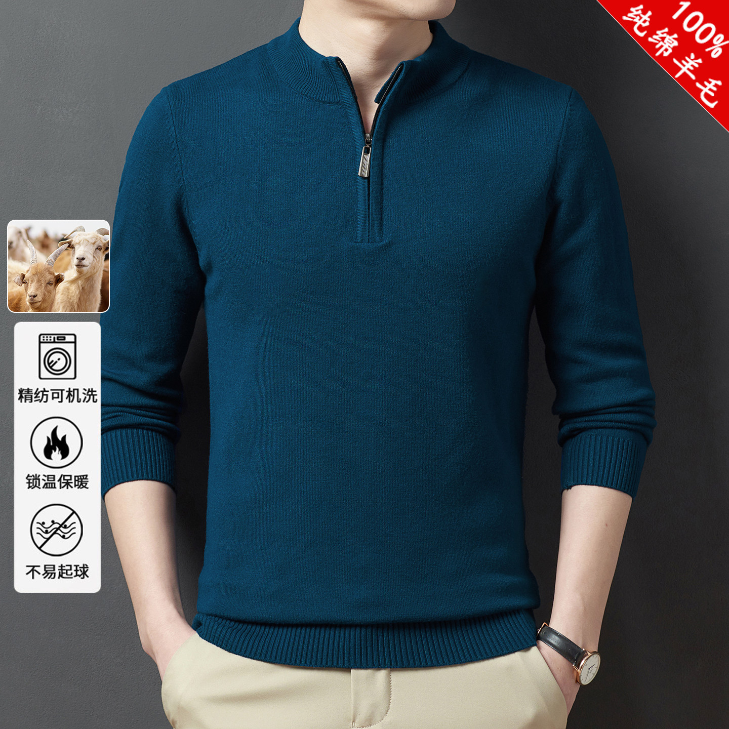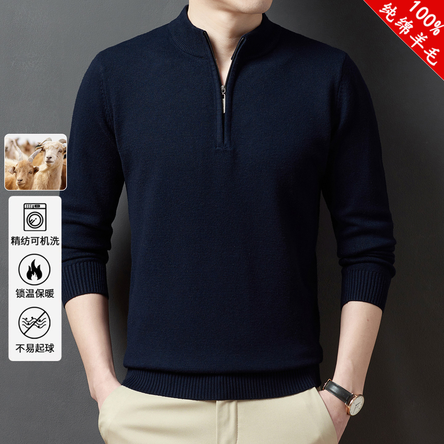 鄂尔多斯市100纯羊毛衫男士半拉链立领针织打底毛衣中年爸爸秋装
