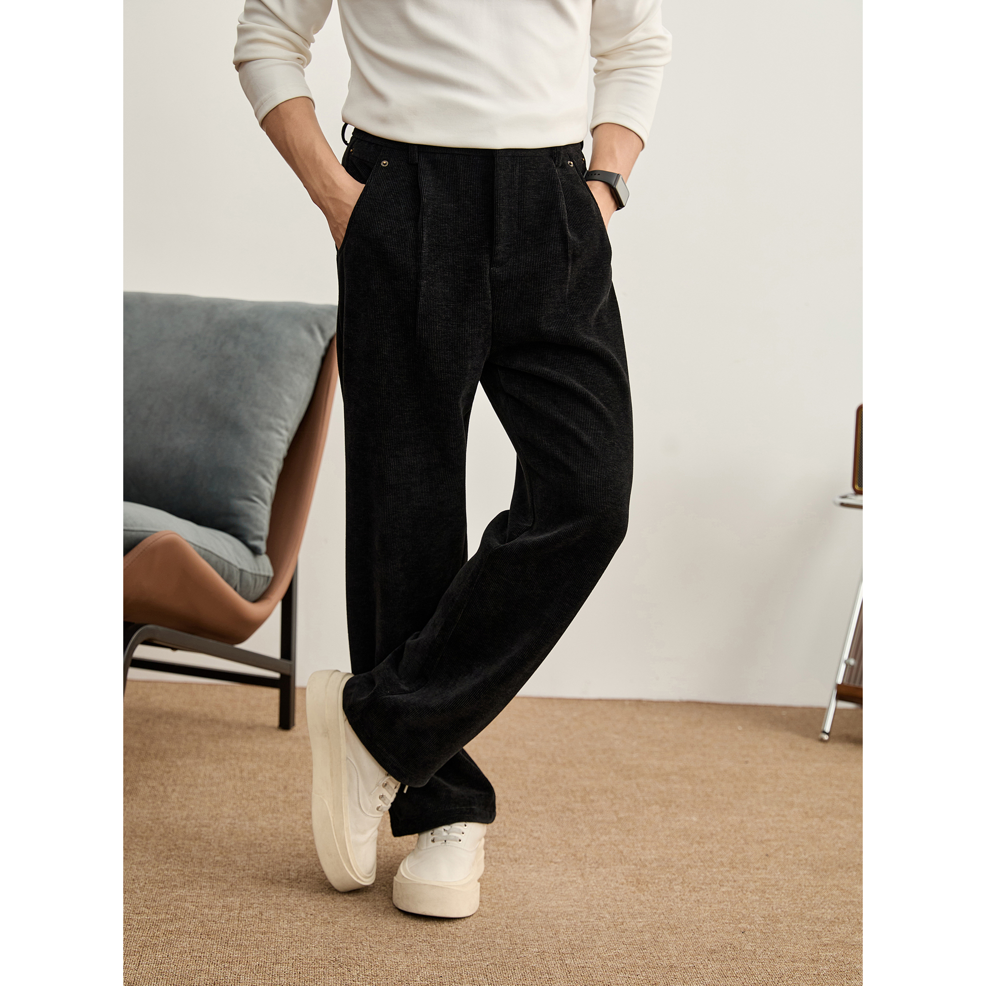 LUUD 黑色百搭灯芯绒保暖直筒休闲裤男肌理感松紧腰内置抽绳长裤
