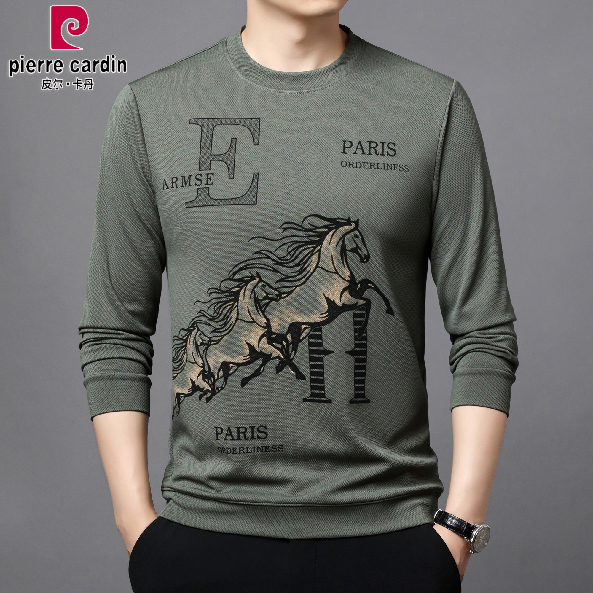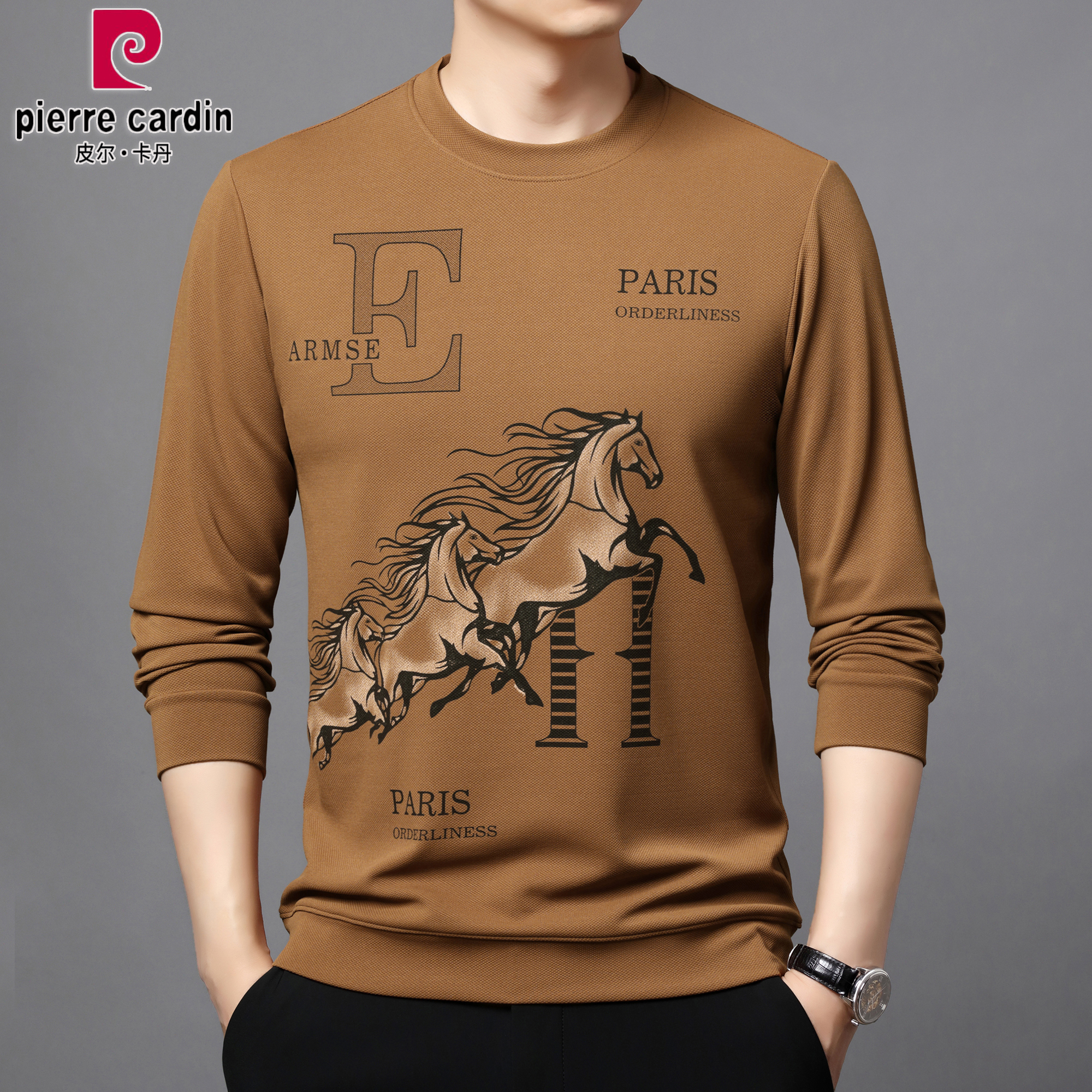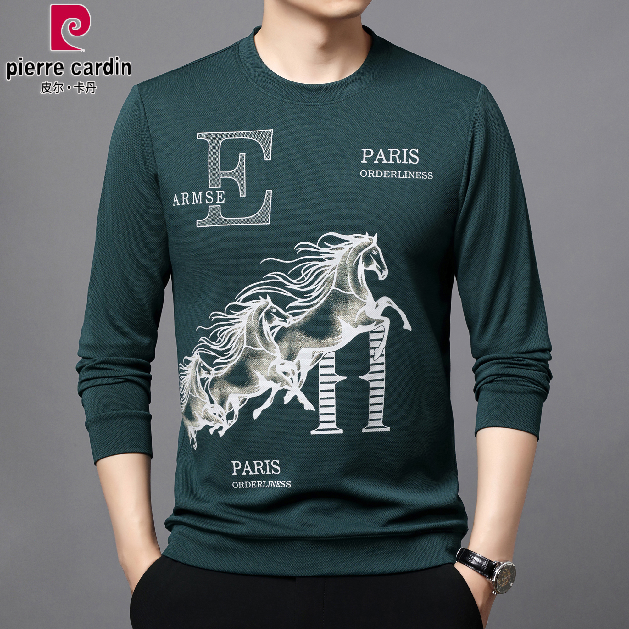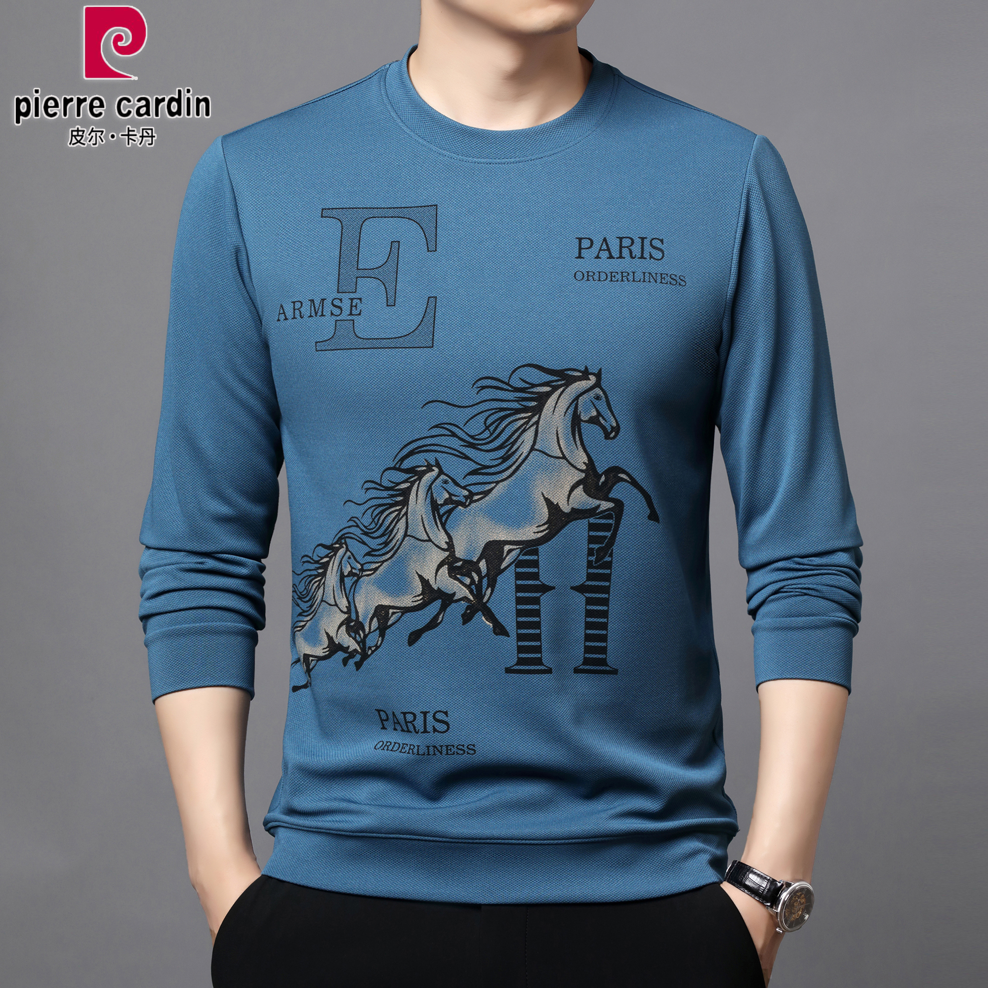 皮尔卡丹秋冬长袖圆领印花T恤