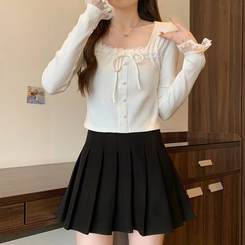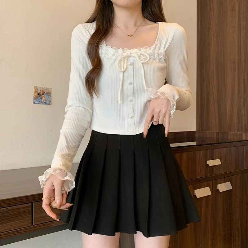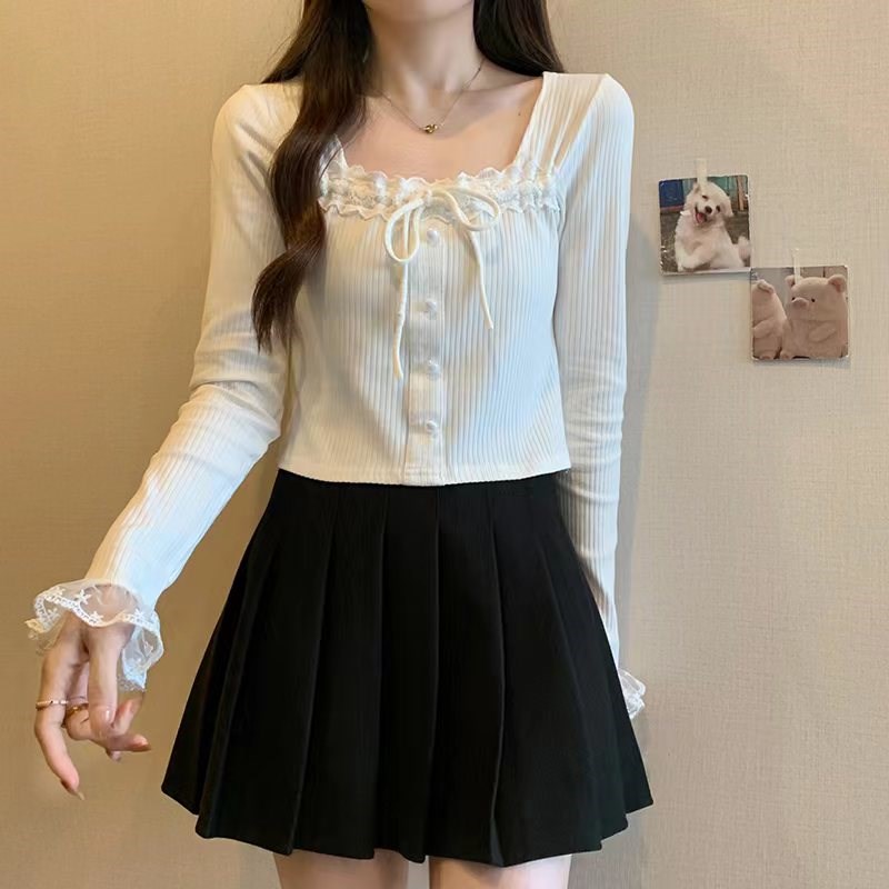 2024新款蕾丝花边长袖T恤女修身显瘦白色打底衫春季短款内搭上衣