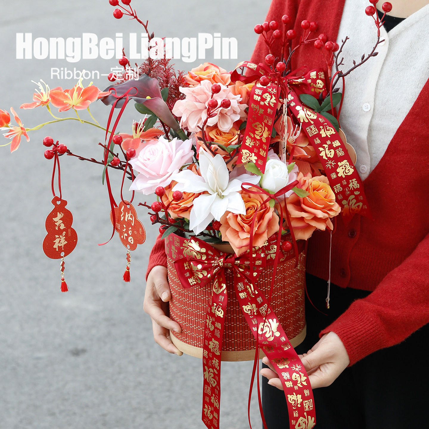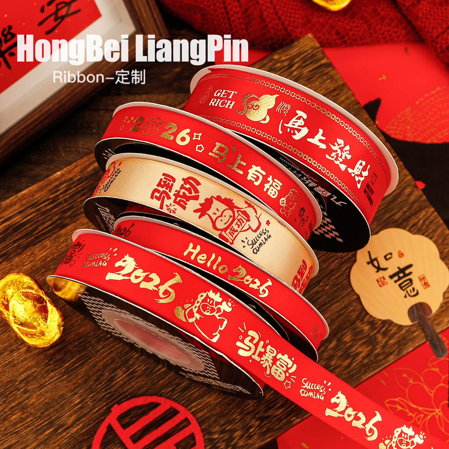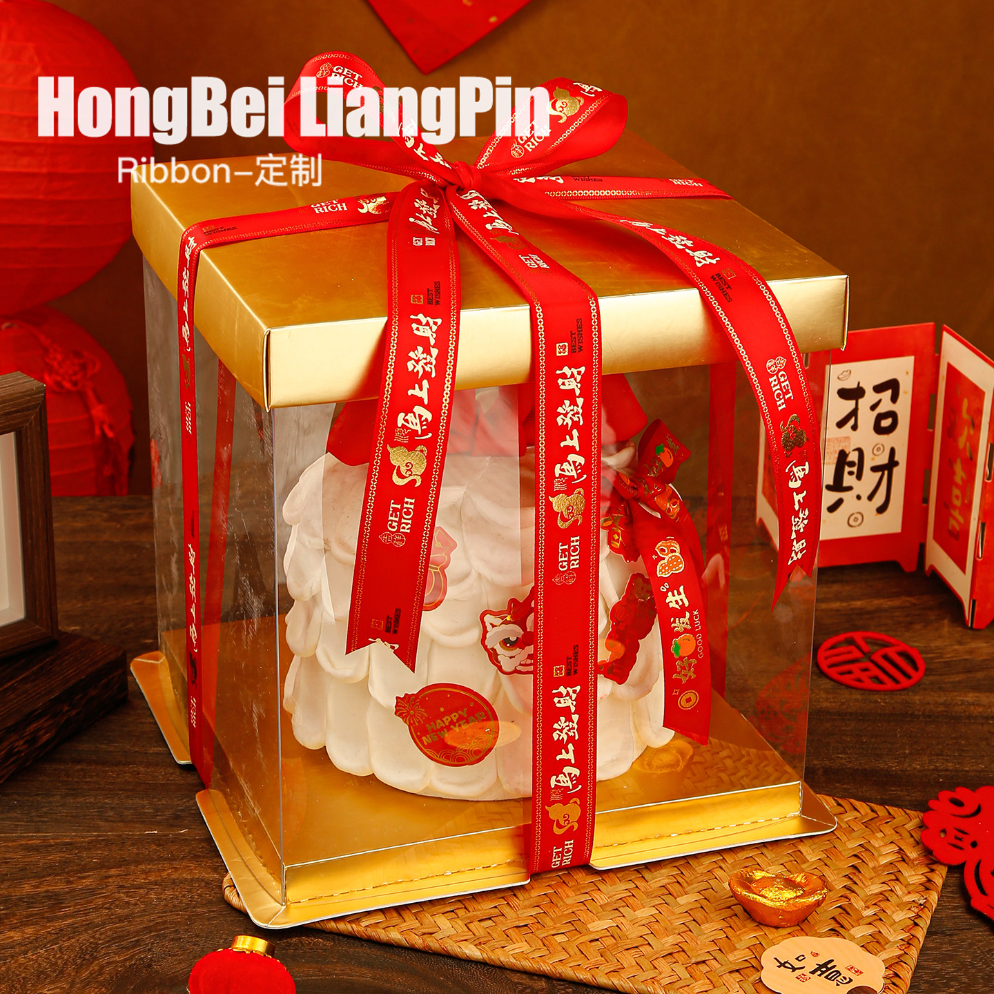烘焙良品2026新年快乐丝带福字红色缎带蛋糕礼盒包装装饰鲜花彩带