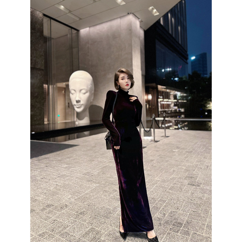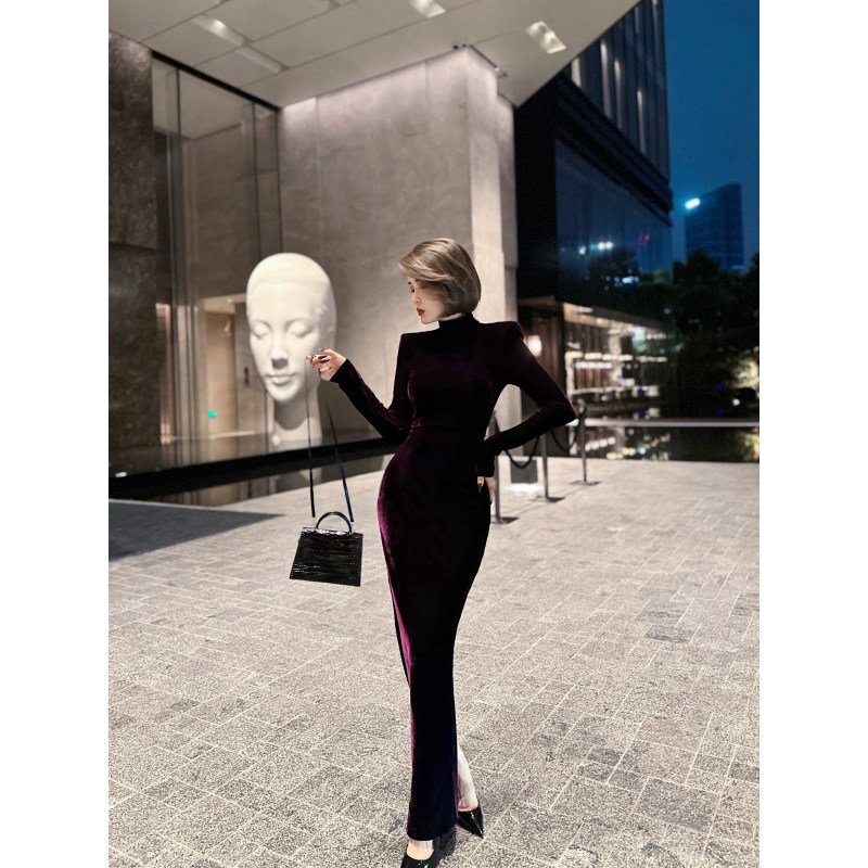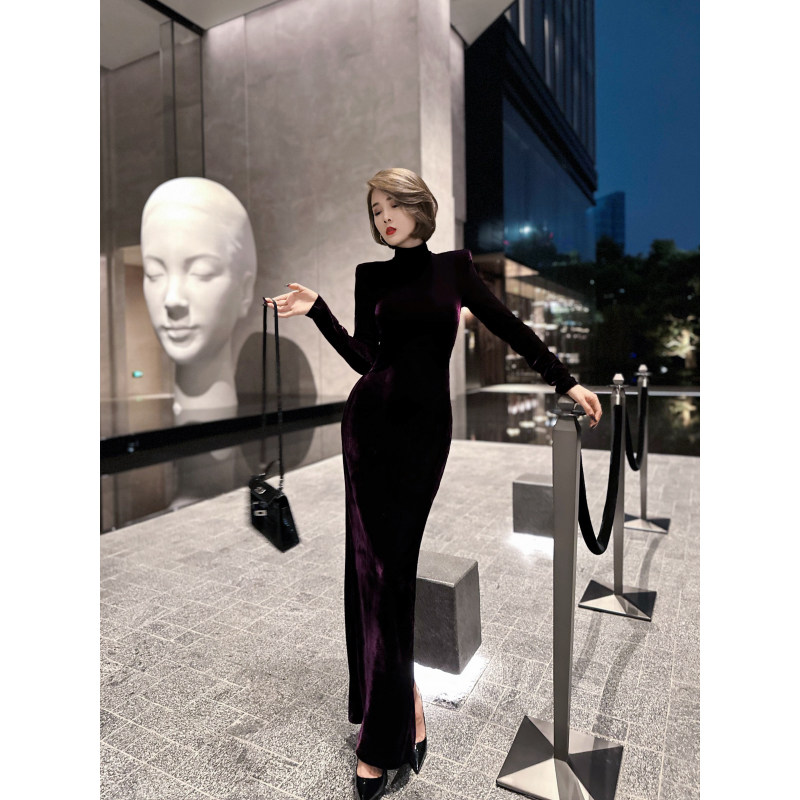 XULU原创气质纯色丝绒优雅知性修身显瘦轻奢高弹力长袖高领连衣裙