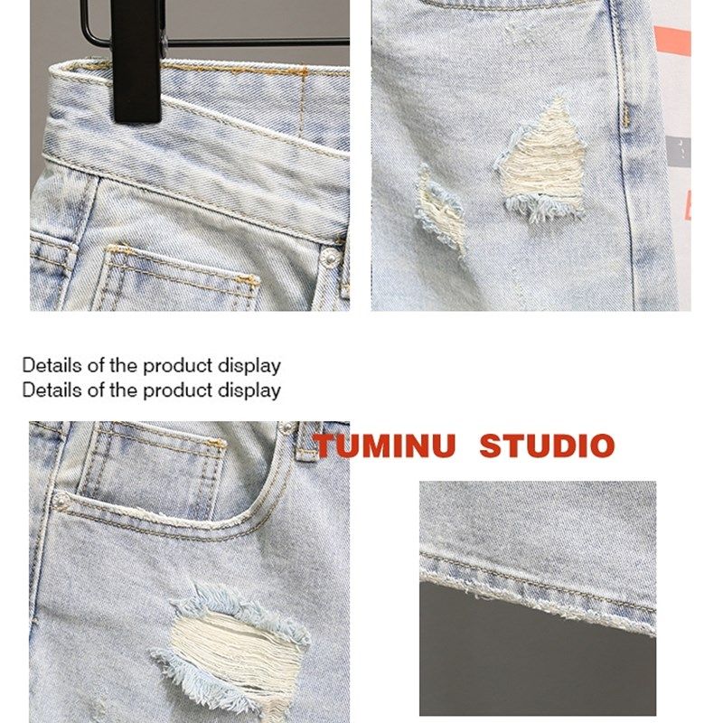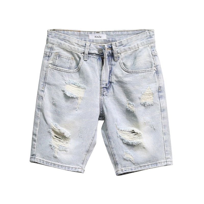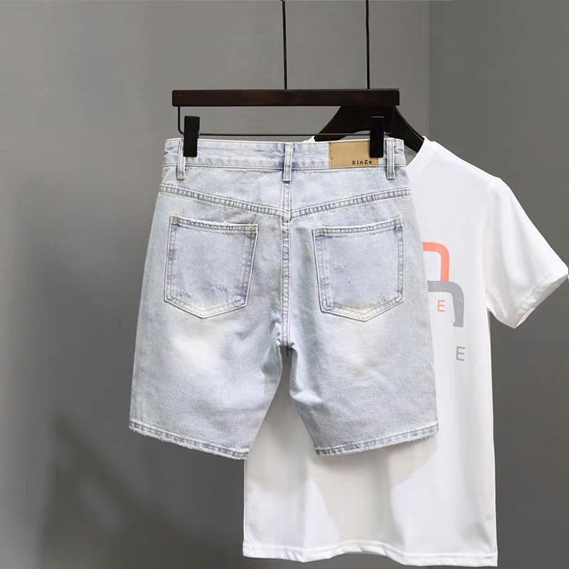 浅色牛仔短裤男夏季薄款潮牌破洞五分裤潮流韩版修身中裤刮烂马裤