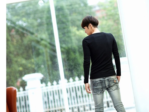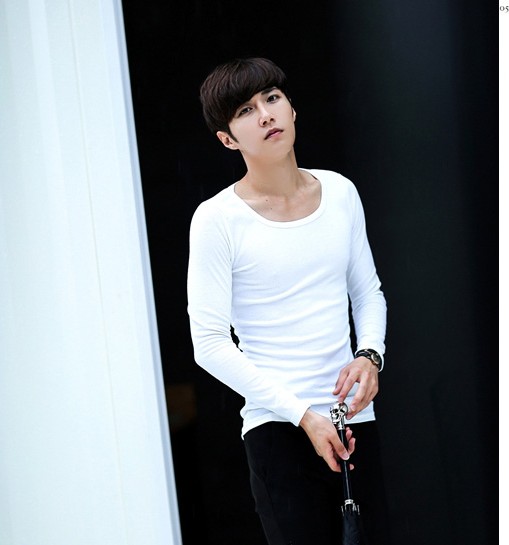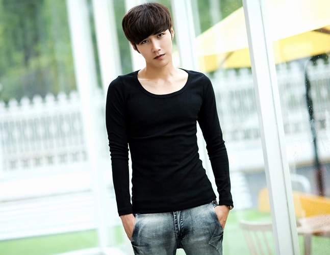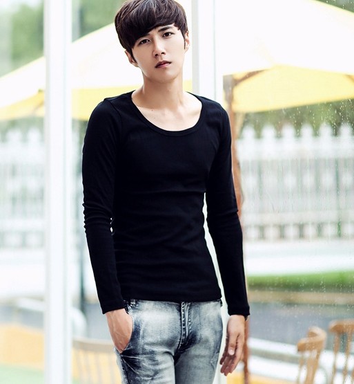 男士长袖T恤纯棉打底衫纯色大圆领黑白色T恤修身秋冬衣男装上衣