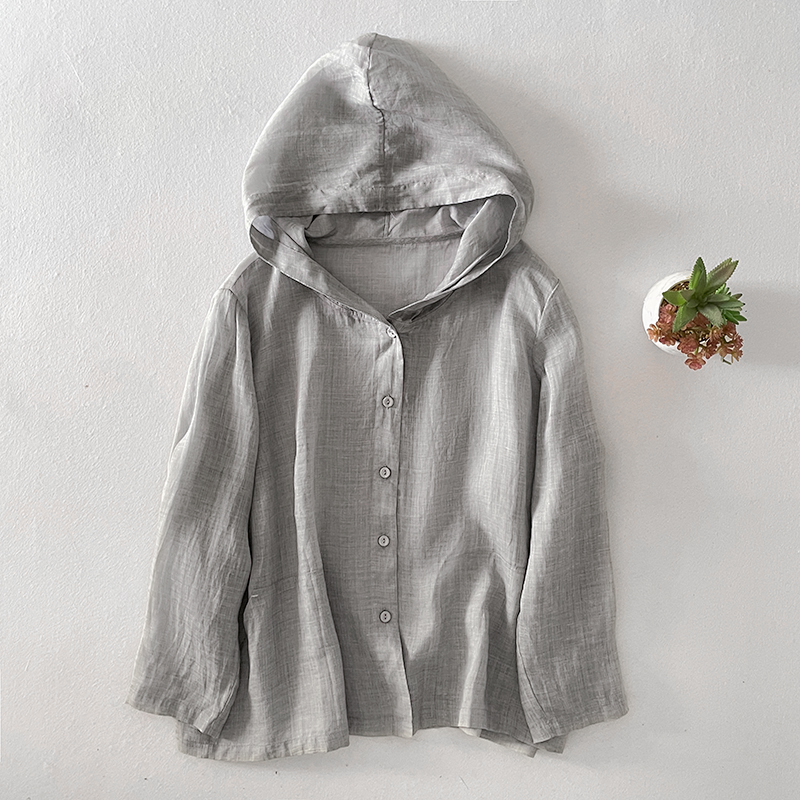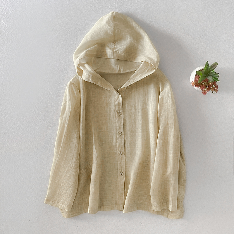 时尚宽松轻薄棉麻连帽衬衫外套女夏文艺百搭防晒衫上衣九分袖开衫