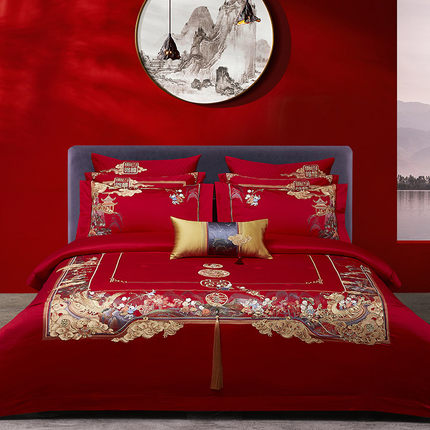中式婚庆100支全棉四件套百子喜字刺绣大红被套S床单结婚床上用品