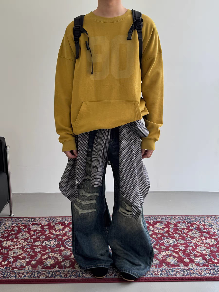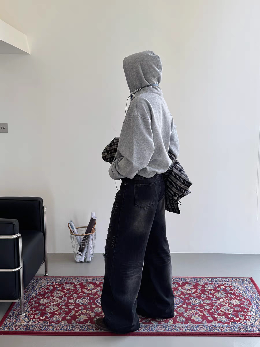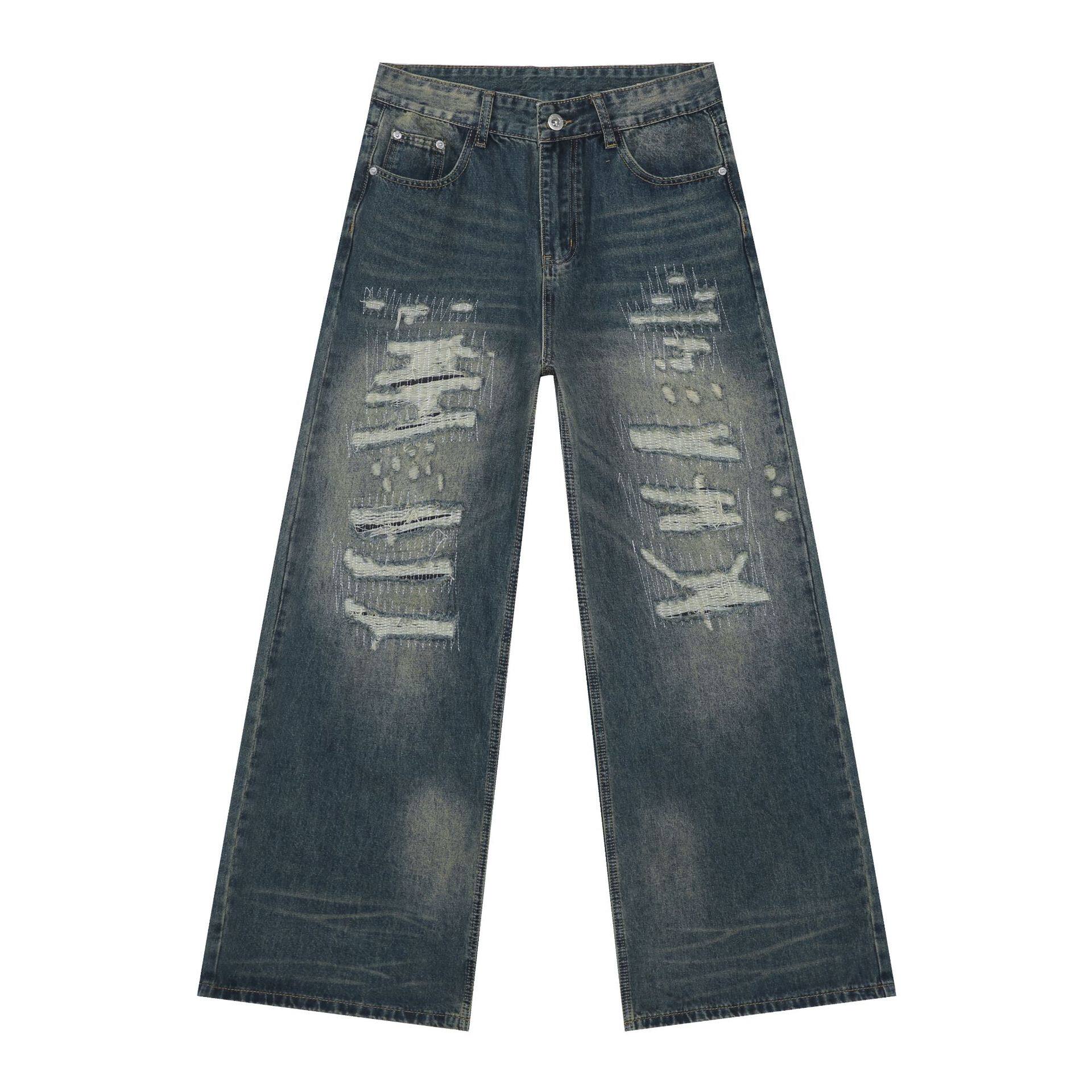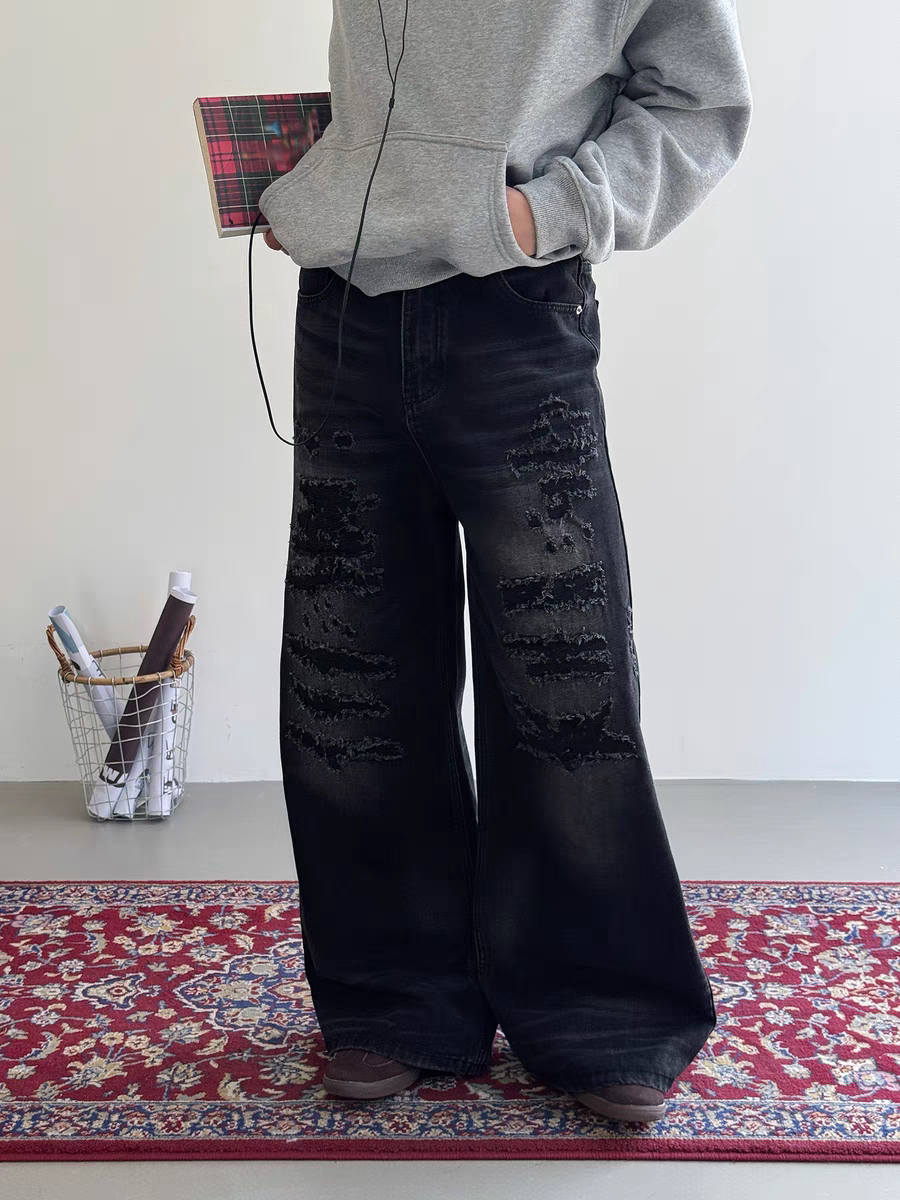 PIFU 秋冬做旧刀割水洗猫须破坏补丁宽松百搭阔腿直筒牛仔长裤