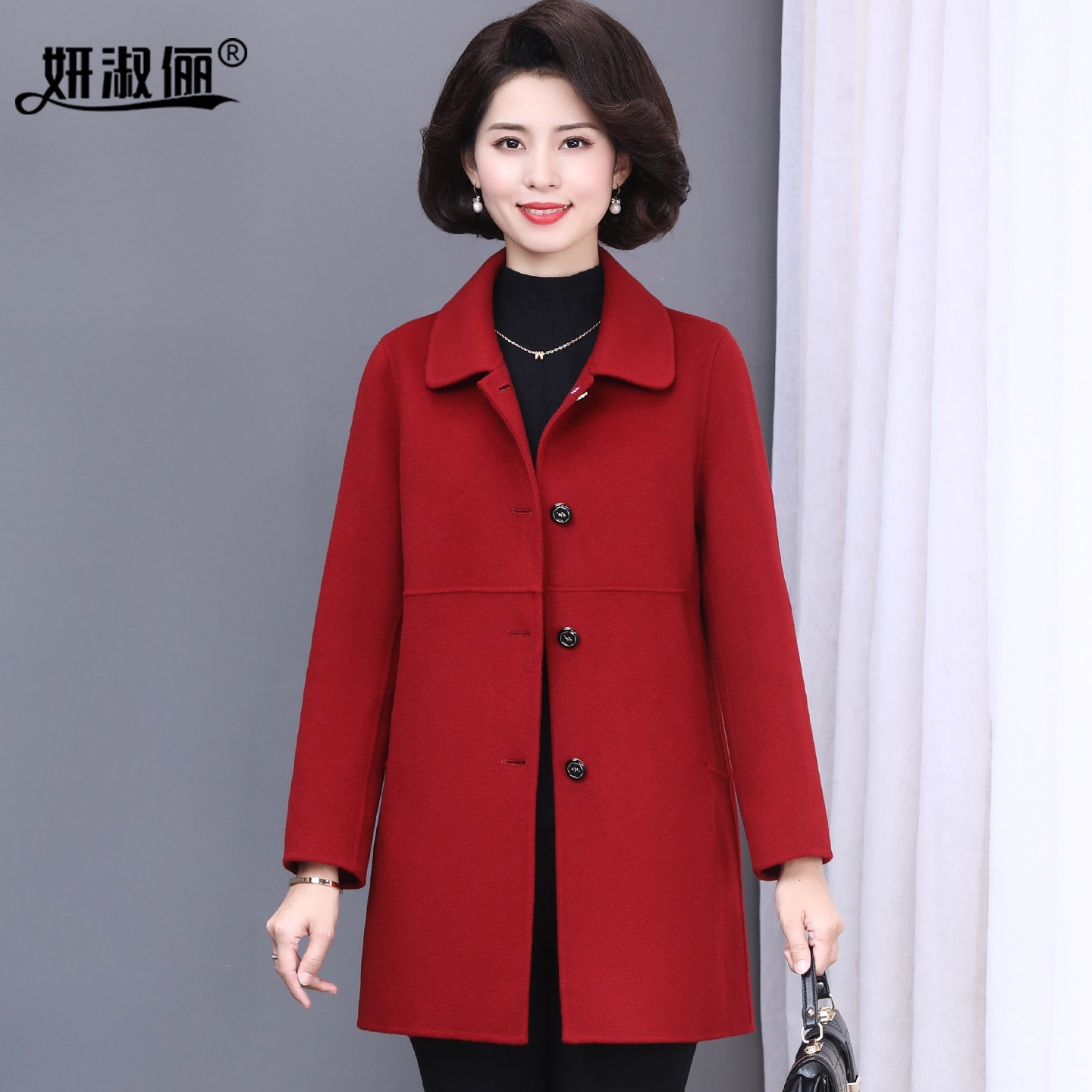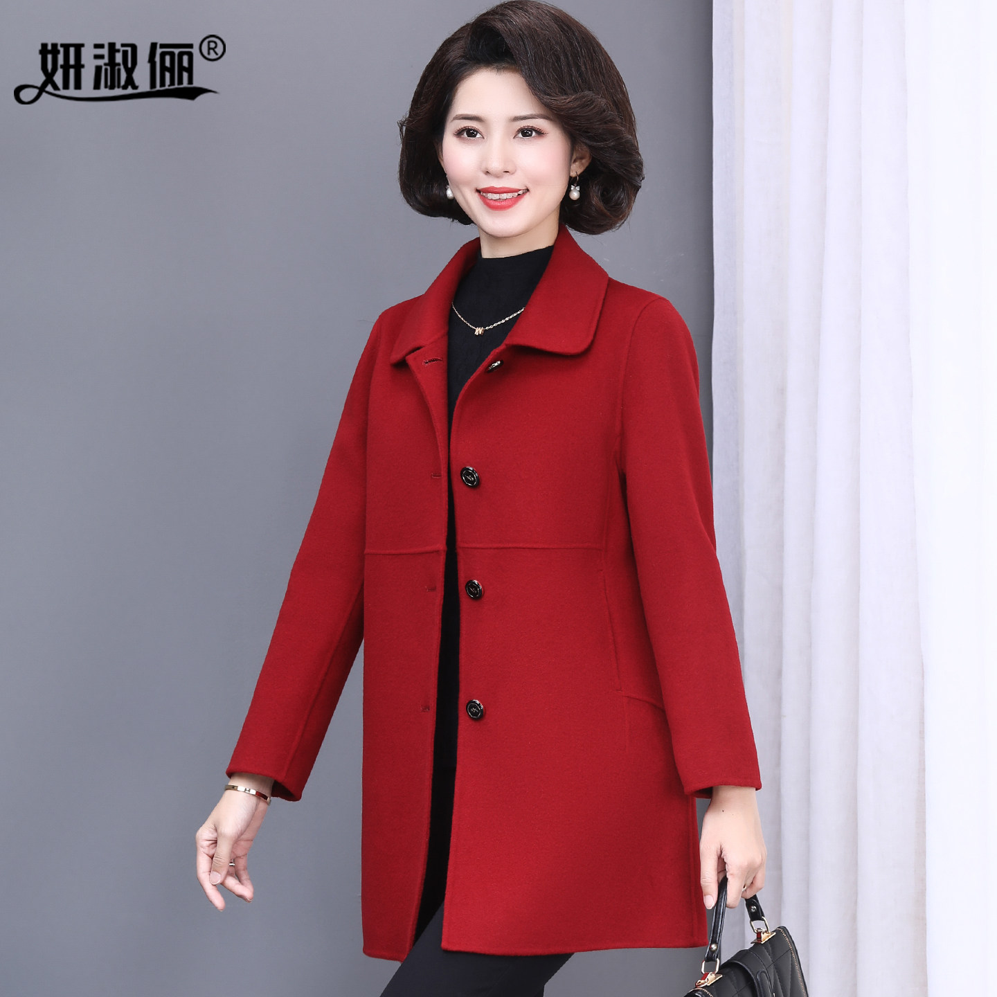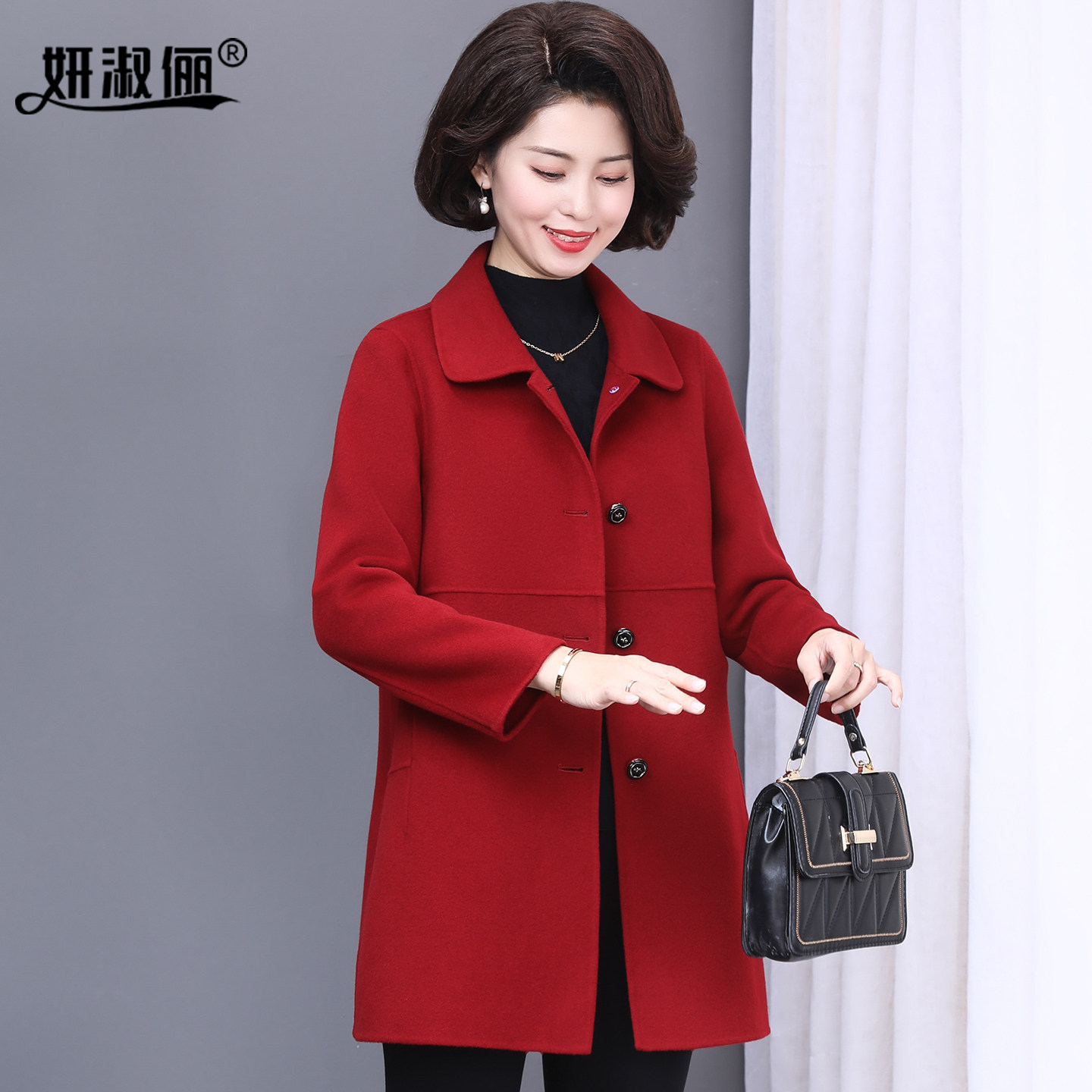 妈妈红色羊毛大衣中长款新年衣服冬季新款中老年女装翻领呢子外套