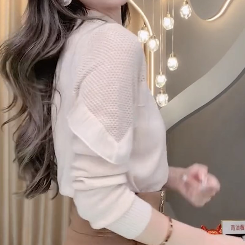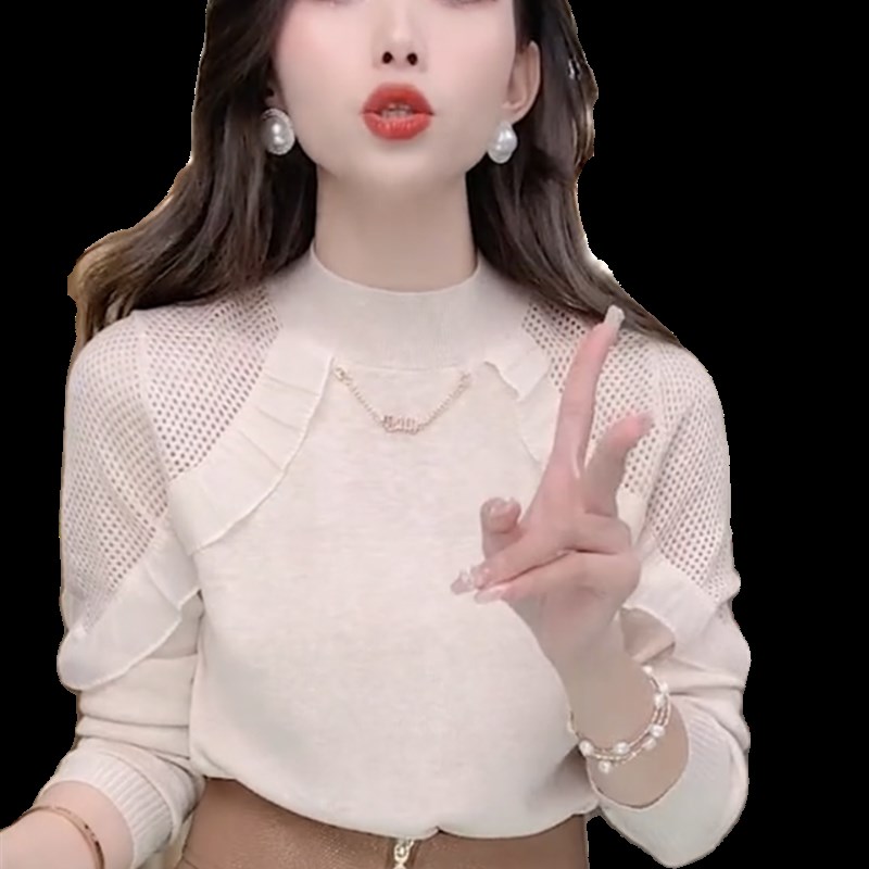 香港TIMO女装设计感半高领镂空针织衫女荷叶边拼接毛衣打底衫秋冬