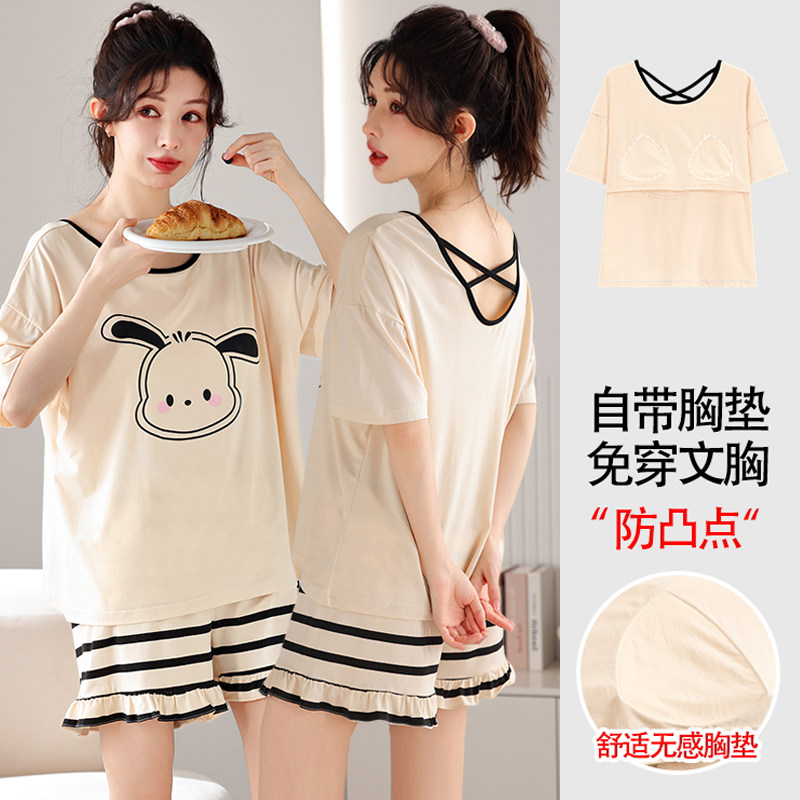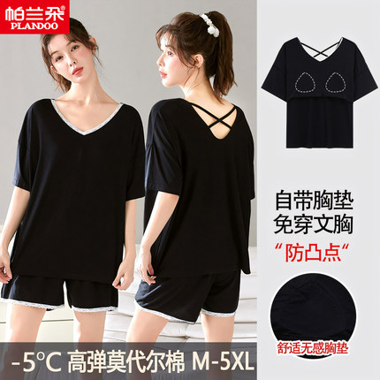 帕兰朵带胸垫莫代尔睡衣女夏薄款冰丝凉感短袖短裤大码家居服套装