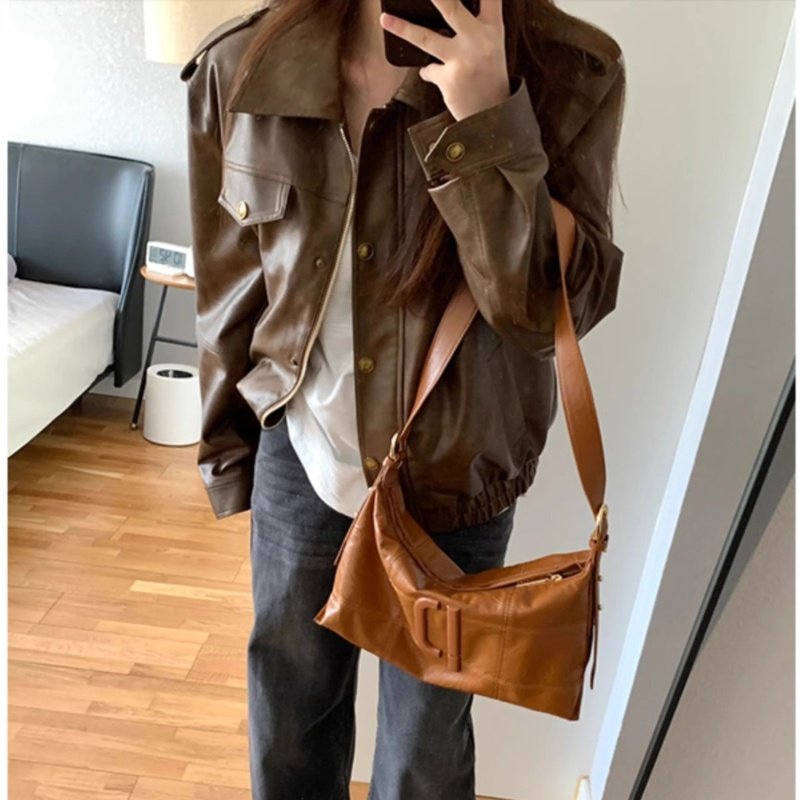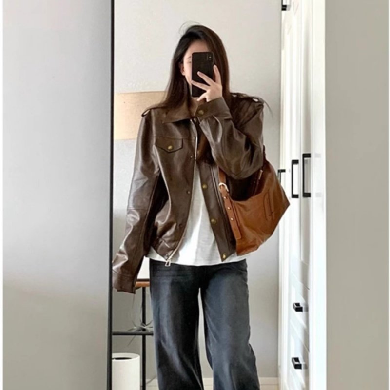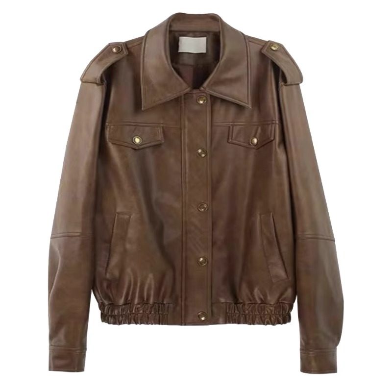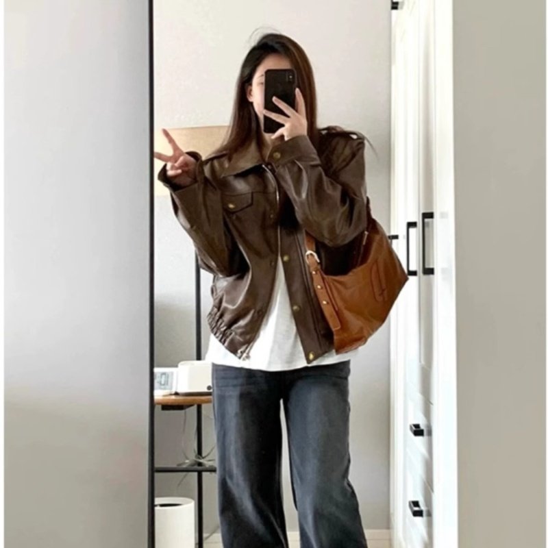 秋冬甜酷风洋气皮夹克外套女时髦炸街复古气质咖色小众机车皮衣PU