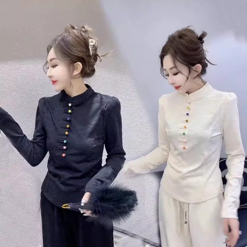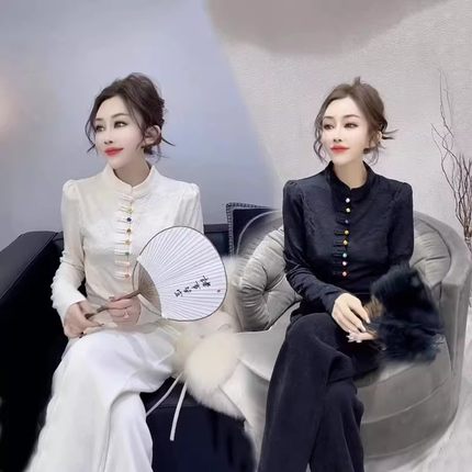 2025秋冬新中式国潮民族风立领盘扣衬衫女T恤复古打底衫内搭衬衣