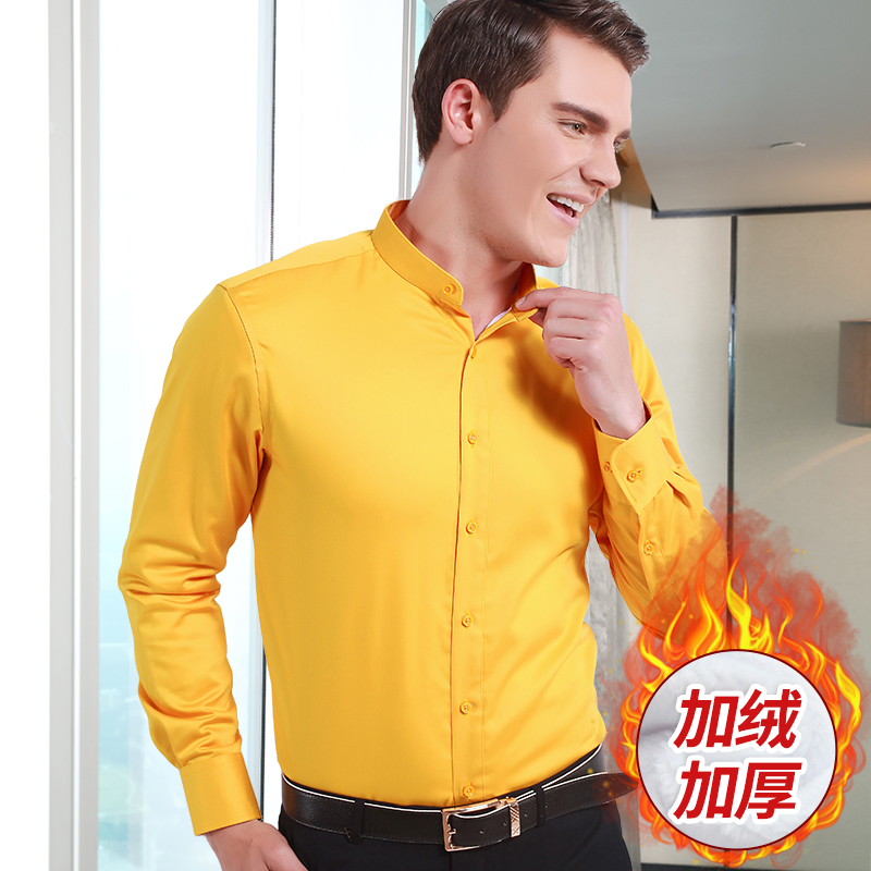 立领衬衫男加绒加厚长袖纯棉白色商务无领圆领中山装男士保暖衬衣