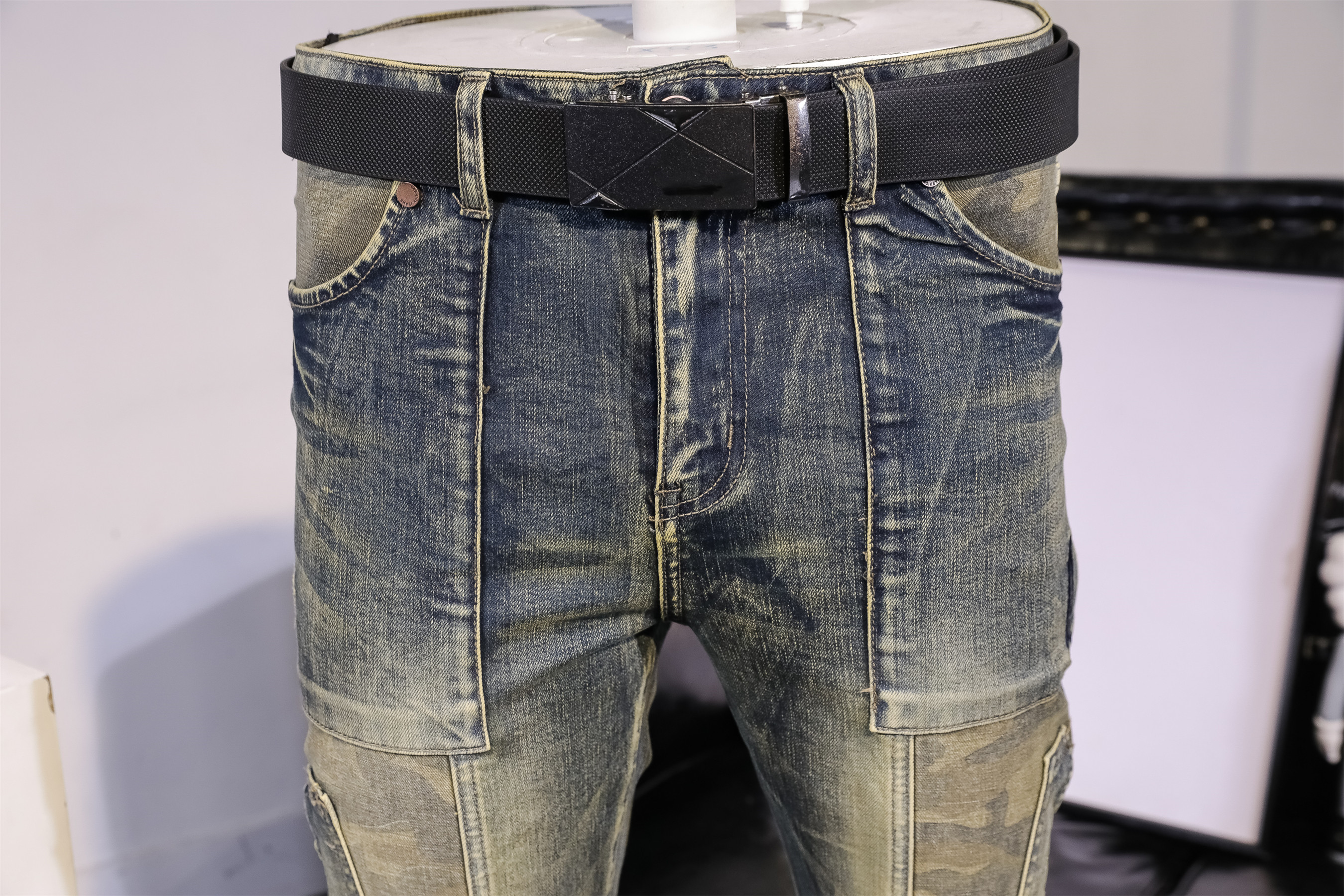 牛仔裤男复古秋冬怀旧时尚欧美休闲日系修身小脚长裤拼接迷彩做旧