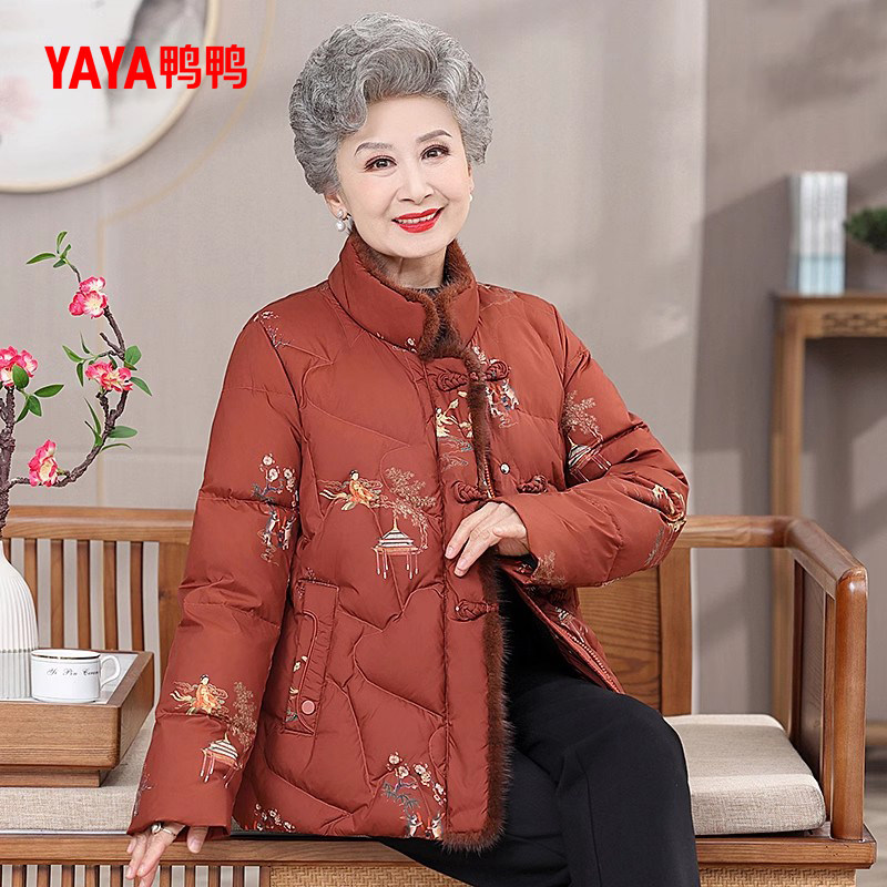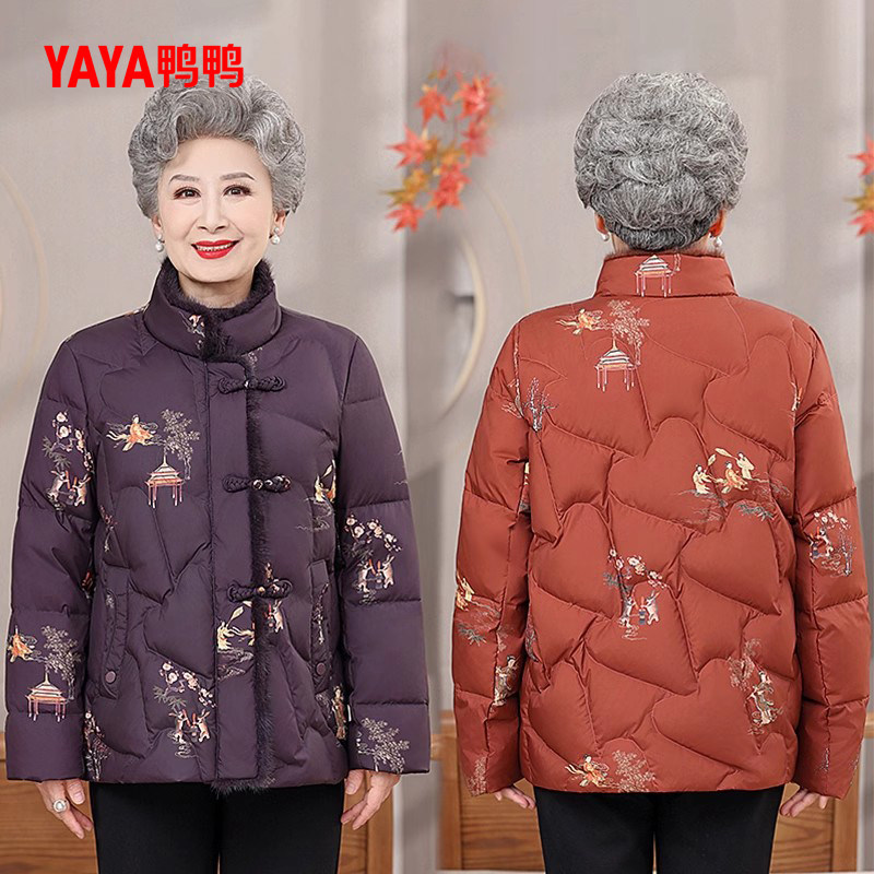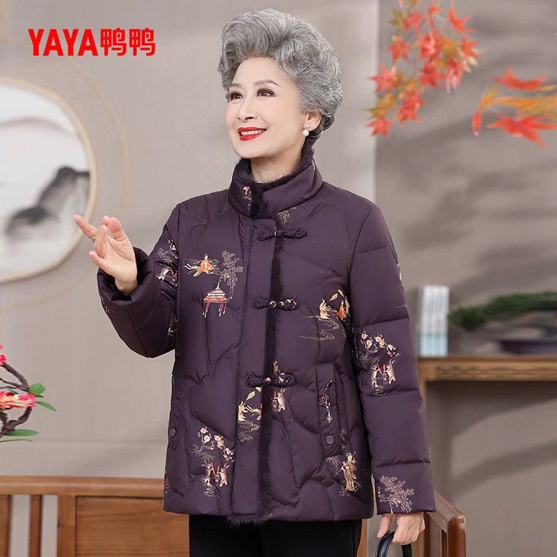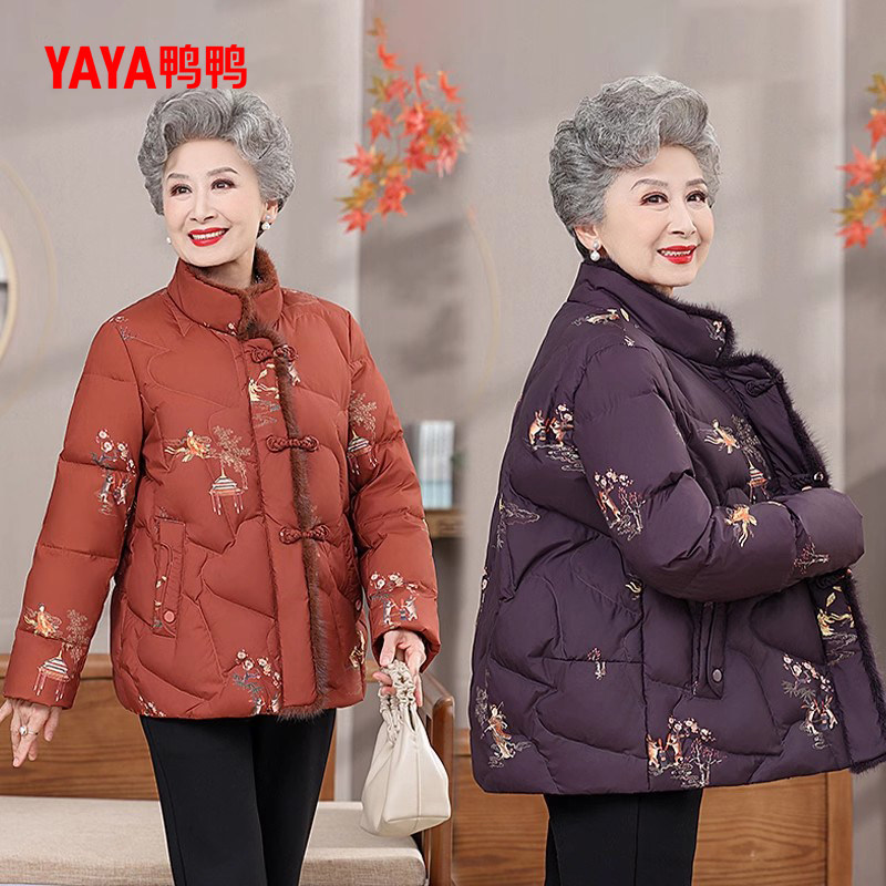 鸭鸭羽绒服女2025冬季新品中老年装立领短款印花民族风奶奶装外套