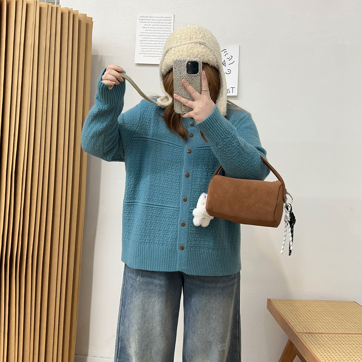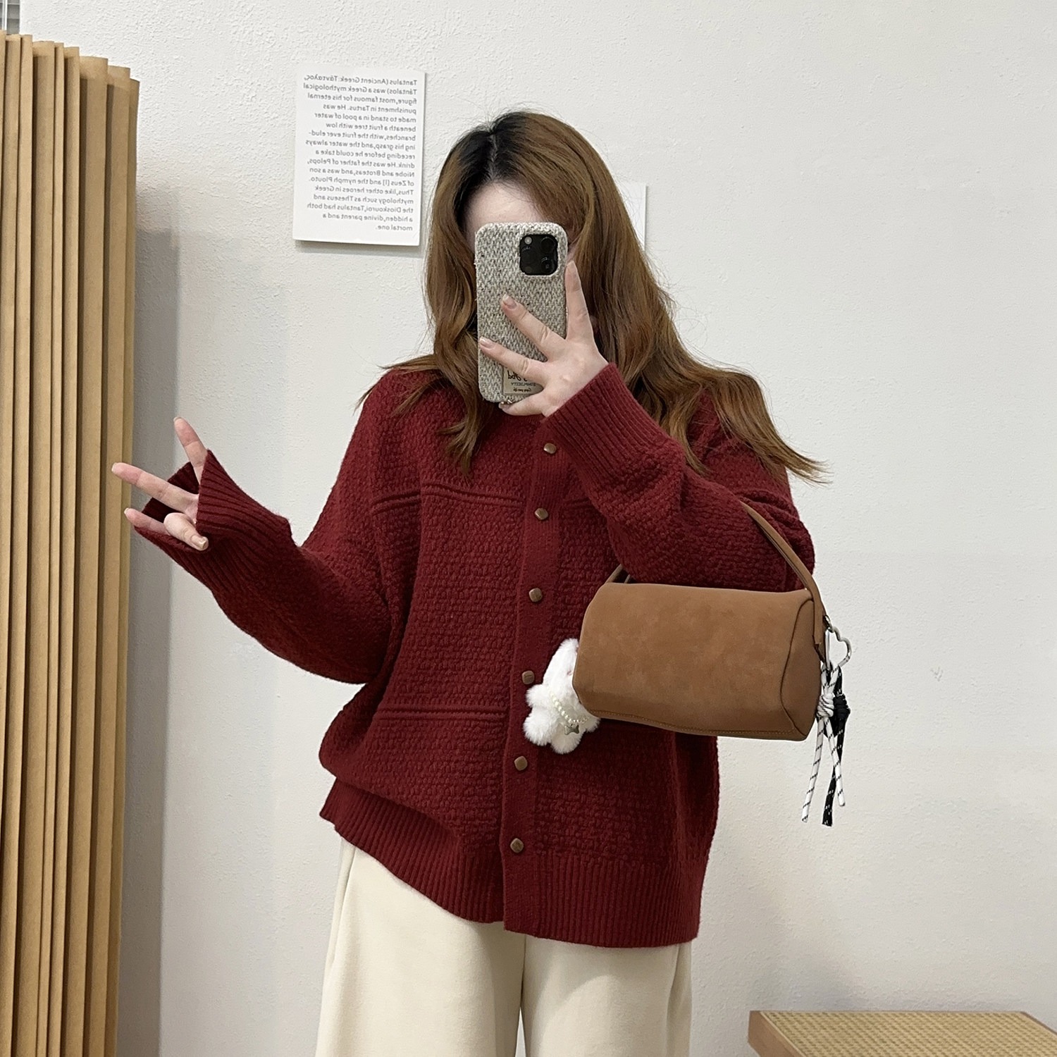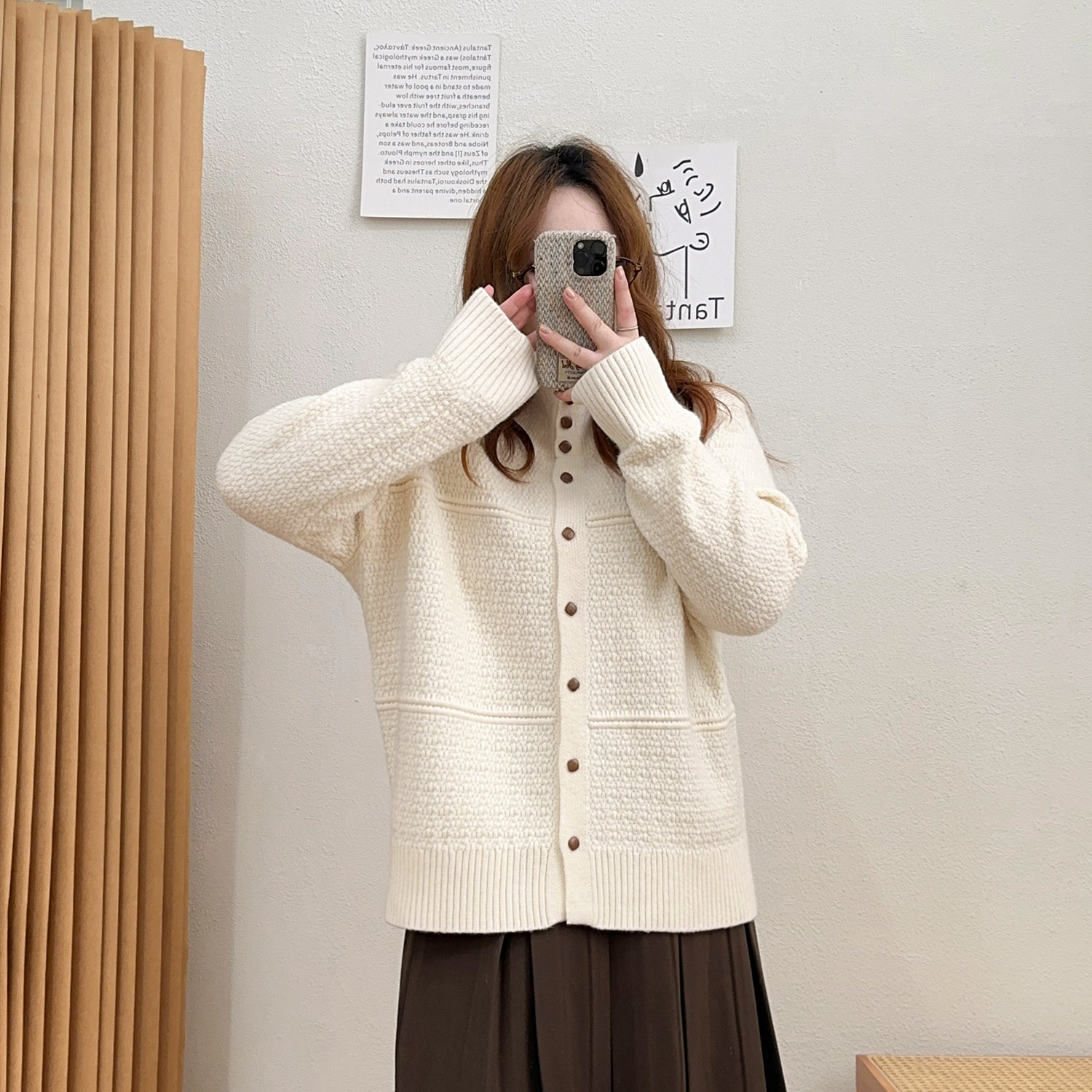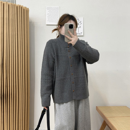 宛宛大码宽松华夫格长袖针织开衫女秋冬季胖mm显瘦设计感毛衣上衣
