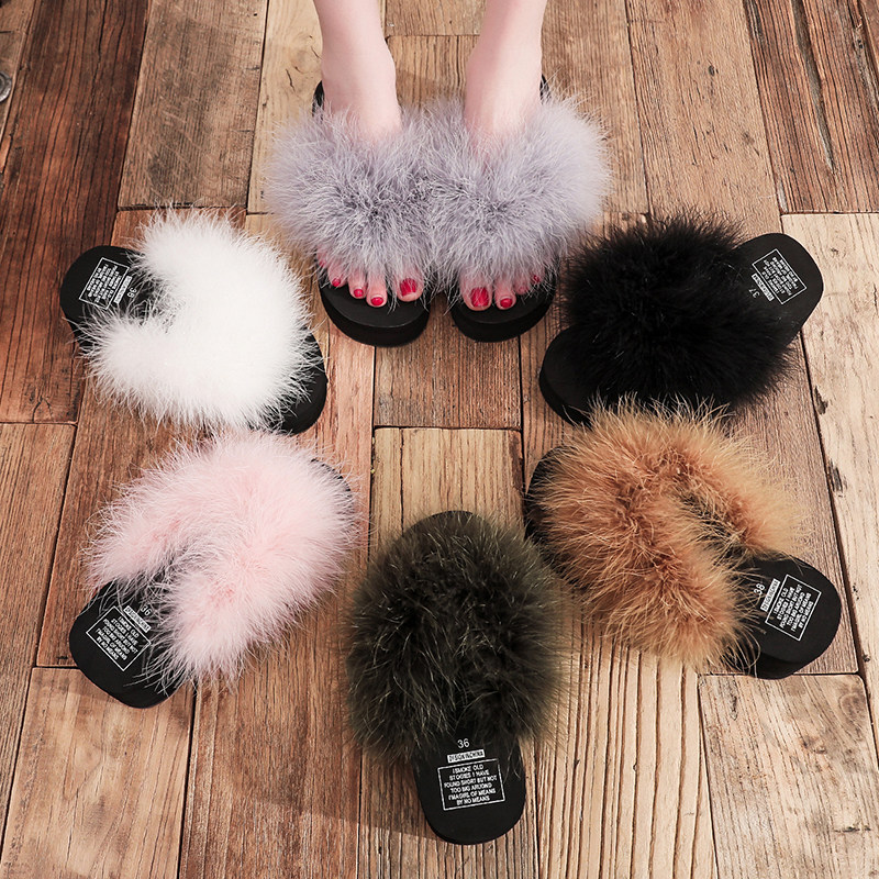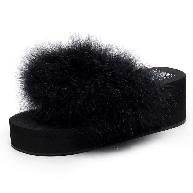 2025新款毛毛拖鞋女夏时尚外穿韩版高跟坡跟网红人字拖羽毛凉拖