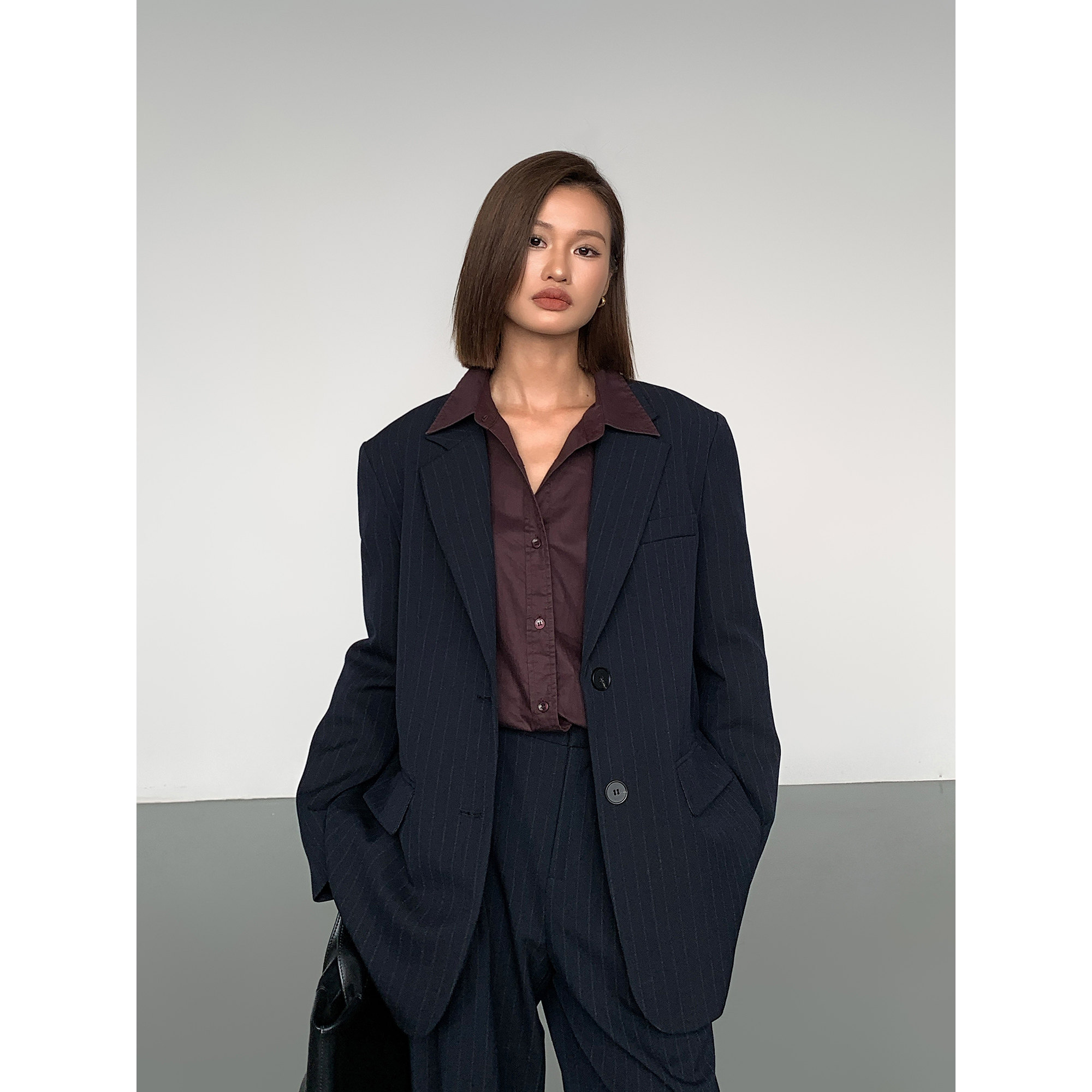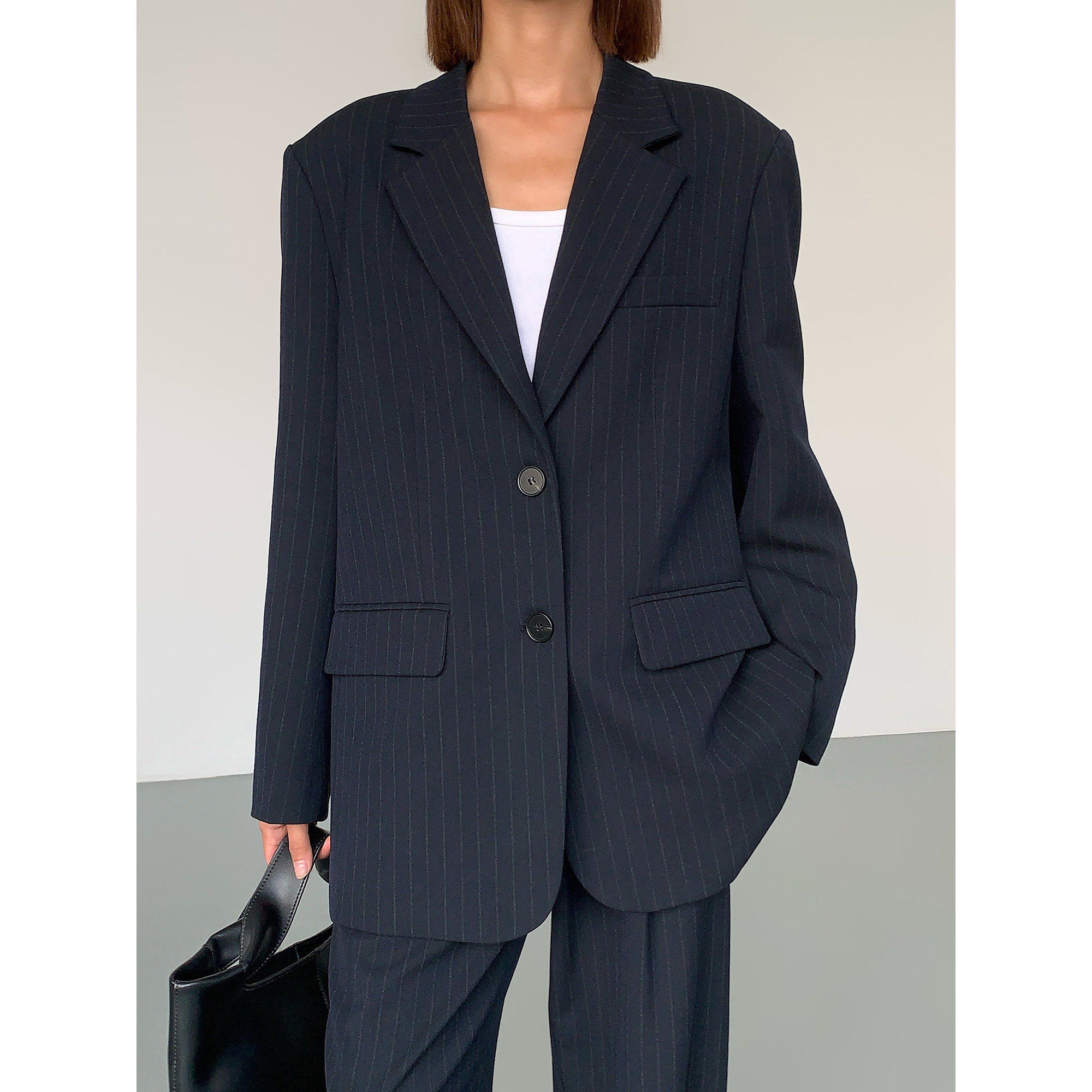 休闲宽松微宽肩条纹西装外套