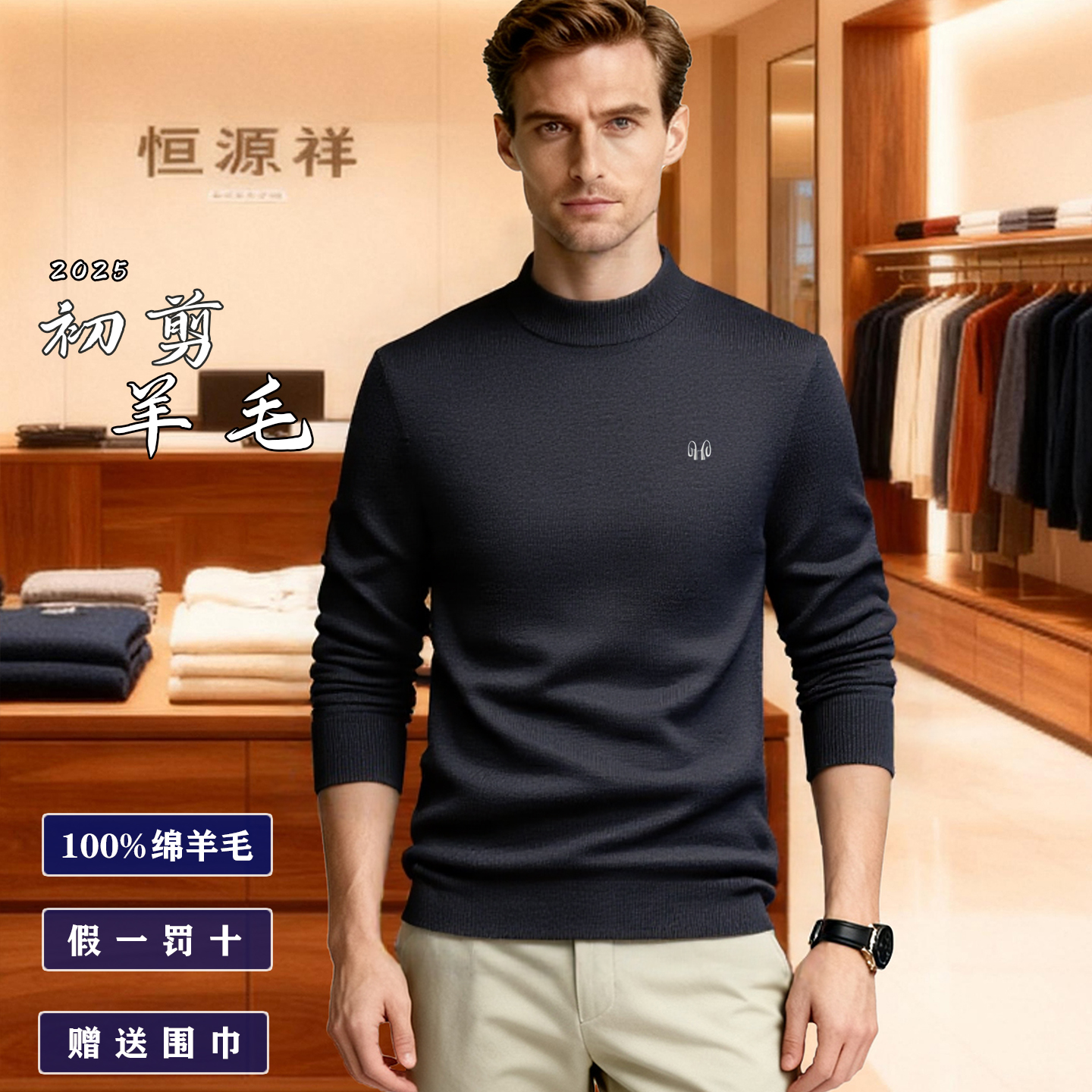 恒源祥羊毛衫男士半高圆领加厚2025冬季高端针织新款100纯羊毛衣
