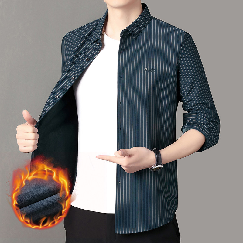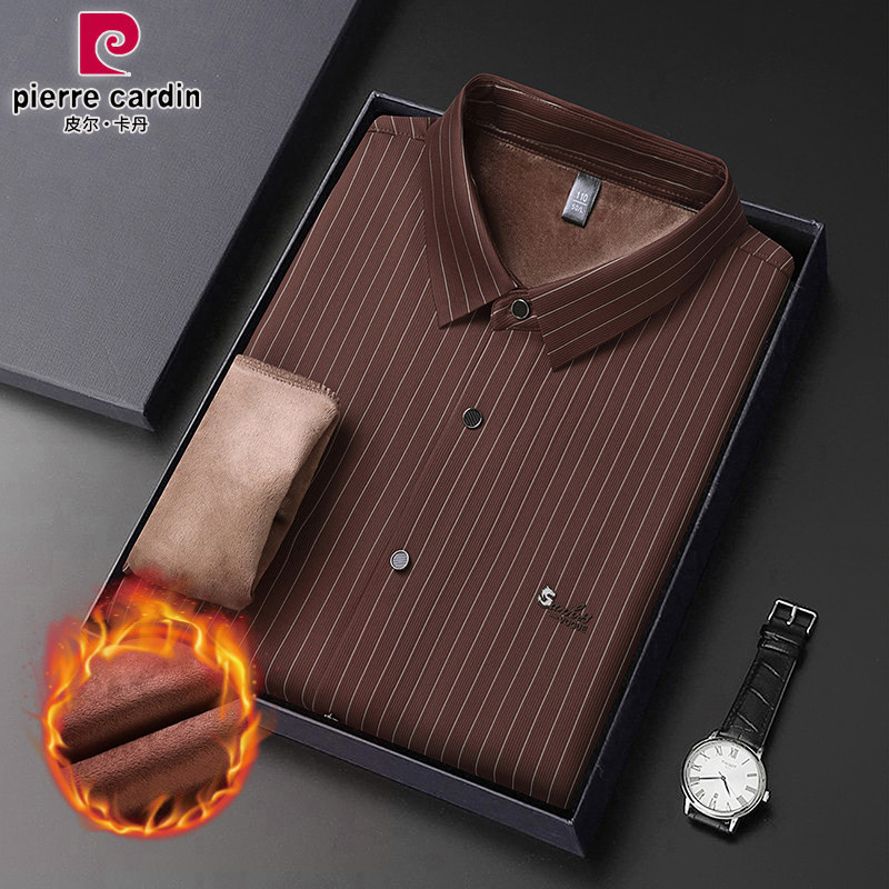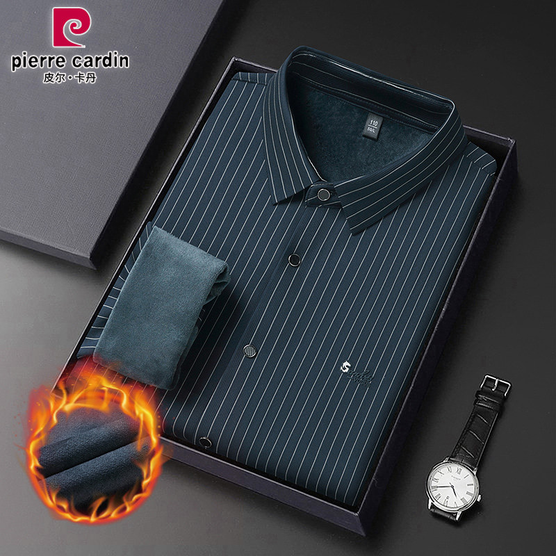 皮尔卡丹加绒加厚长袖衬衫男宽松商务休闲抗皱免烫工装条纹衬衣