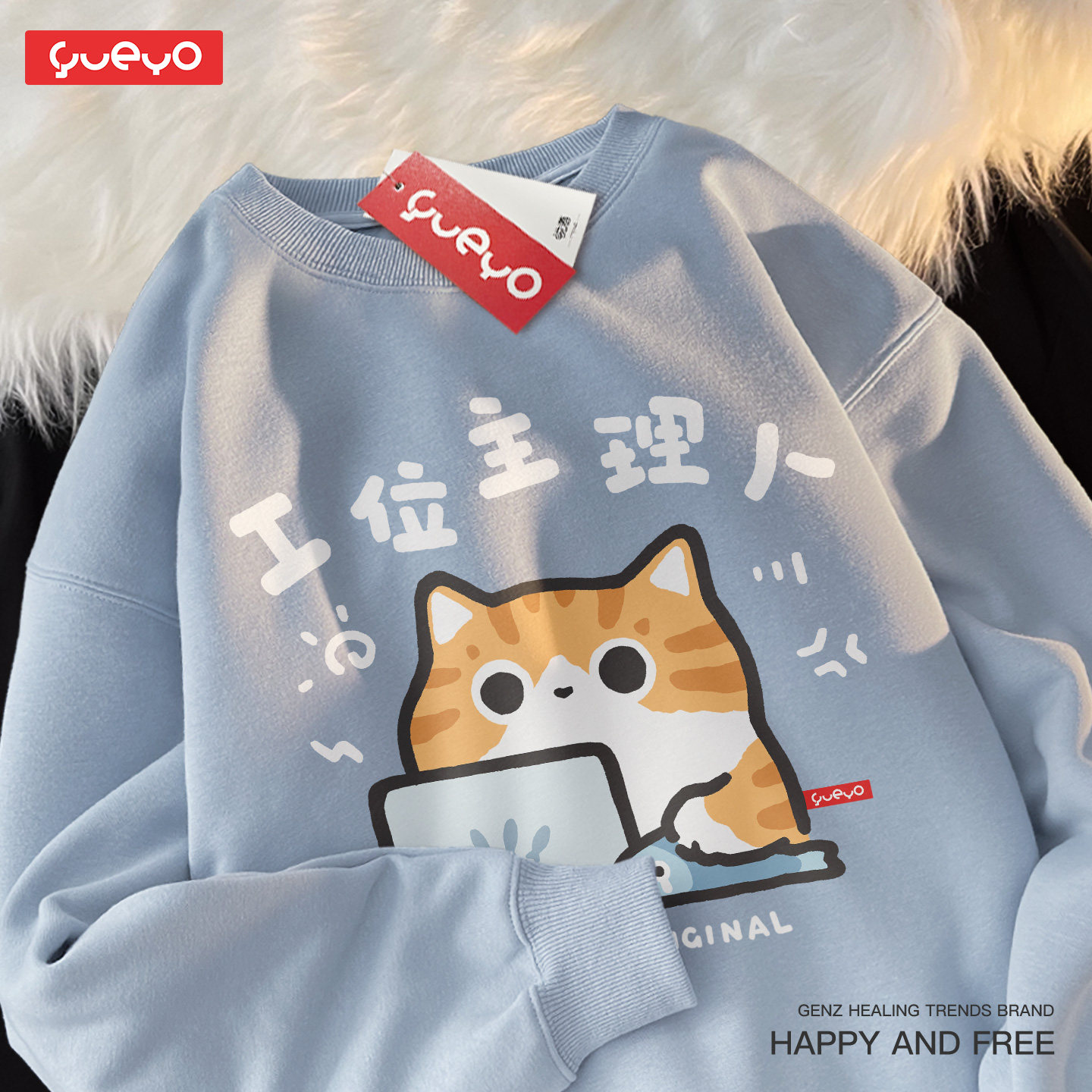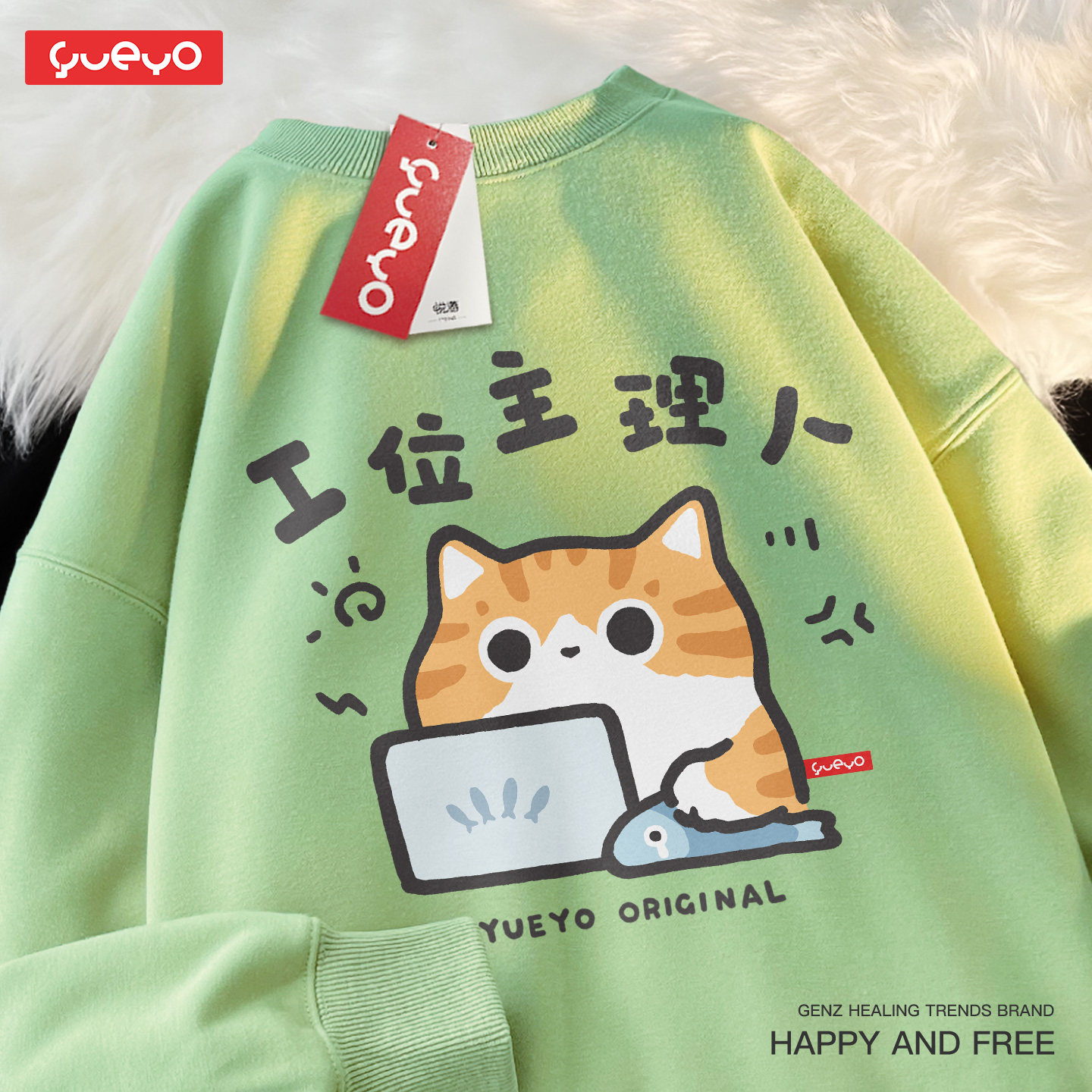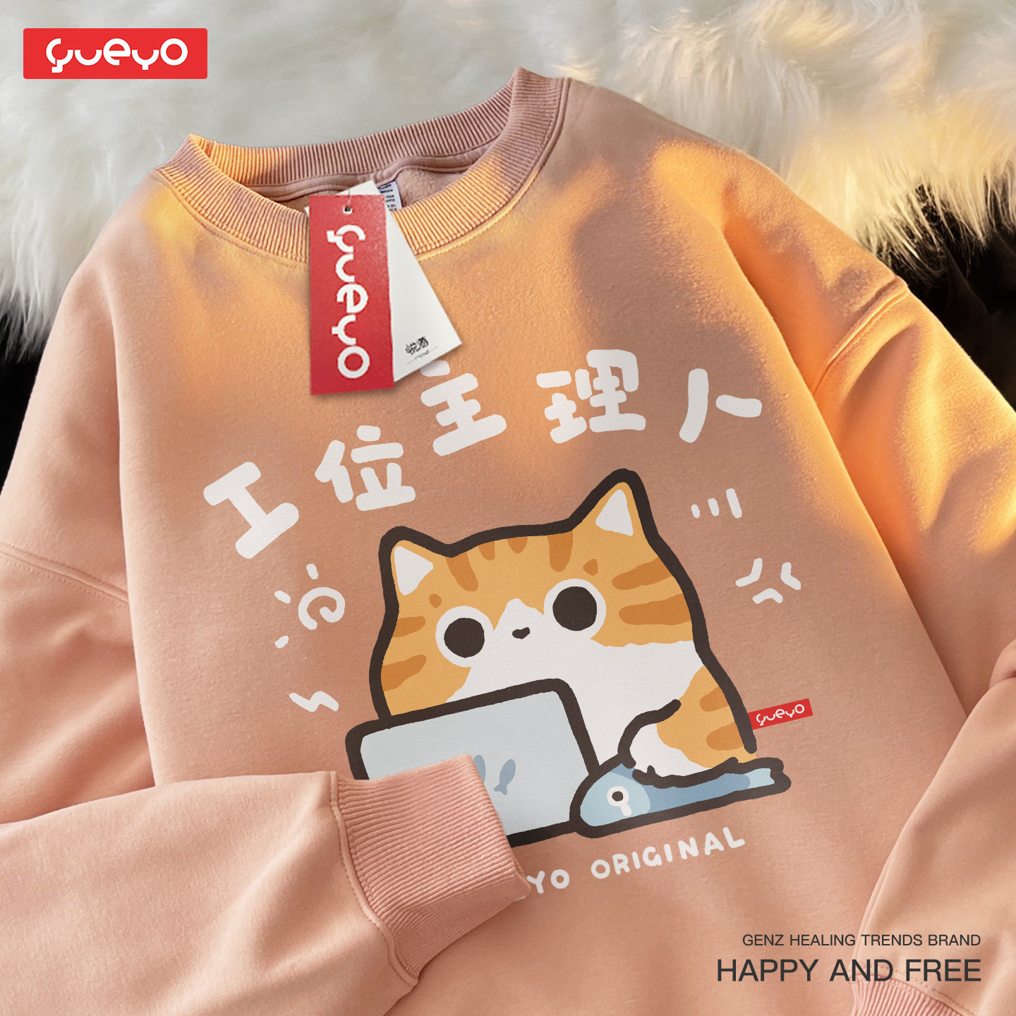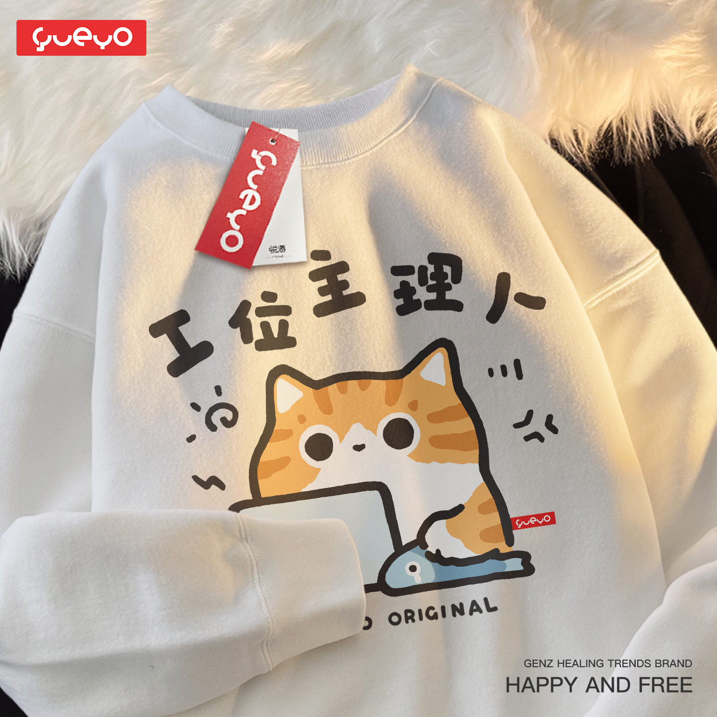 悦游 工位主理人 卡通风圆领卫衣男潮流原创打工橘猫印花加绒套头