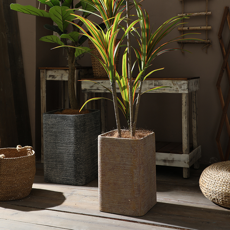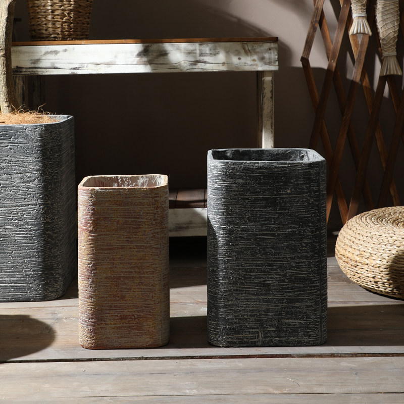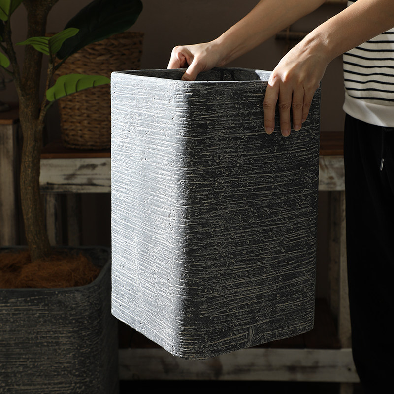 侘寂风高正方镁泥落地大花盆粗陶面复古做旧拉丝客厅阳台绿植花卉