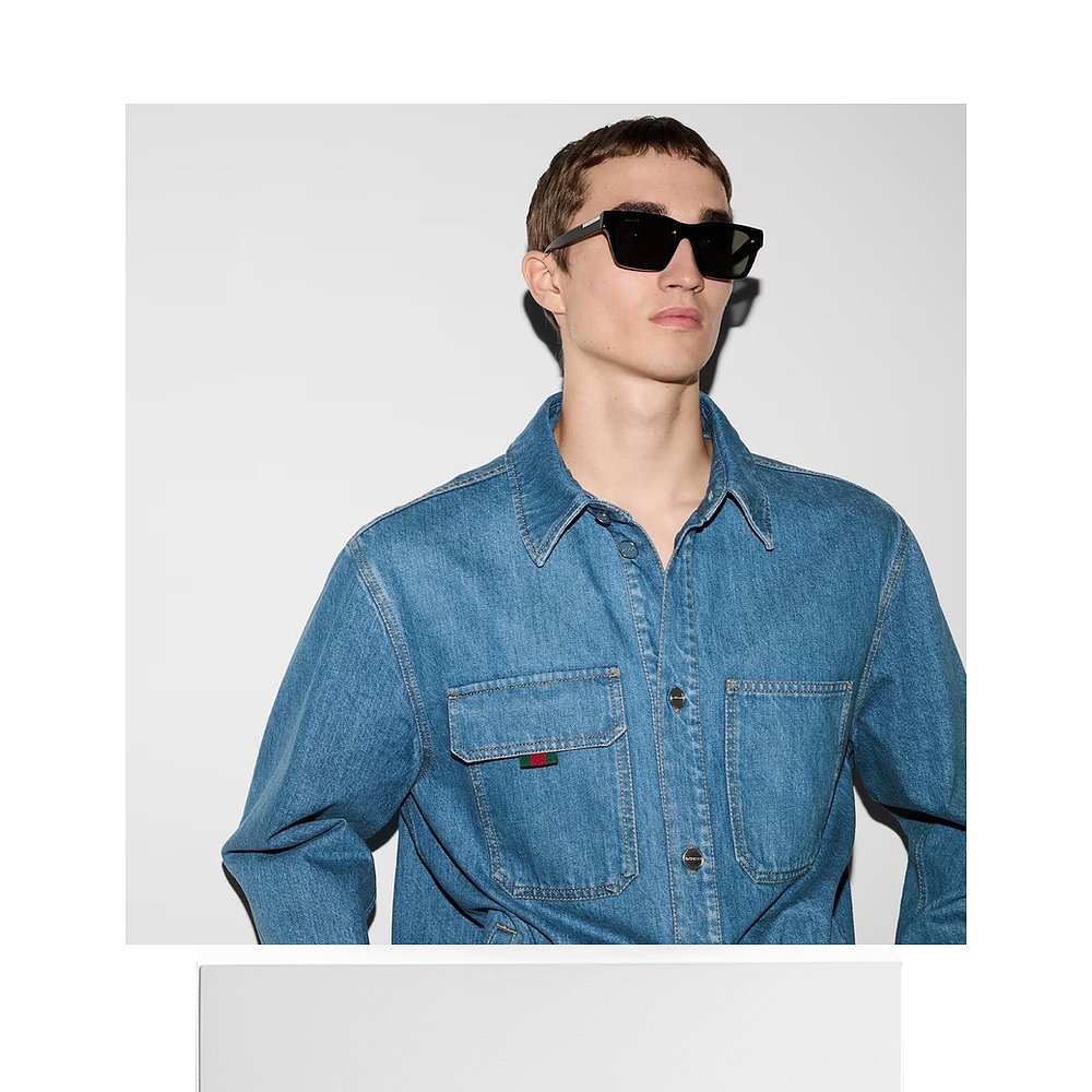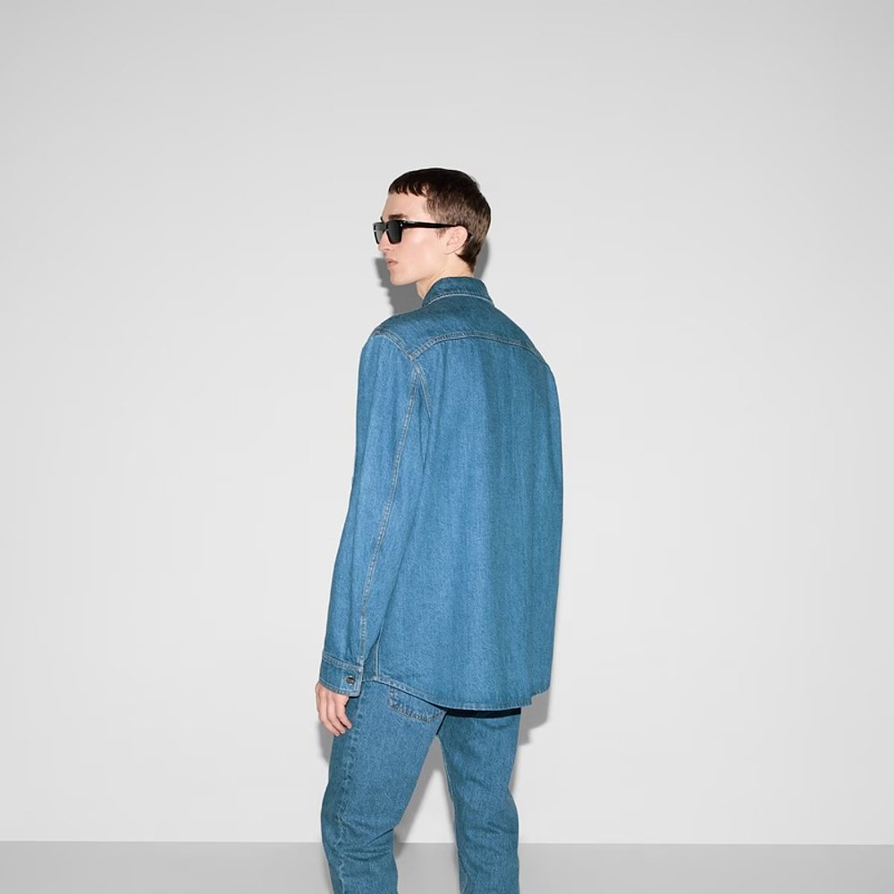 自营欧洲直邮Gucci/古驰 男士蓝色棉条纹织带提环牛仔长袖衬衫