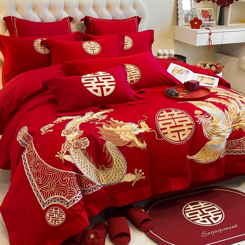 中式龙凤刺绣结婚四件套红色婚庆六件套床单被套喜被床上用品