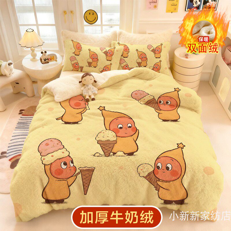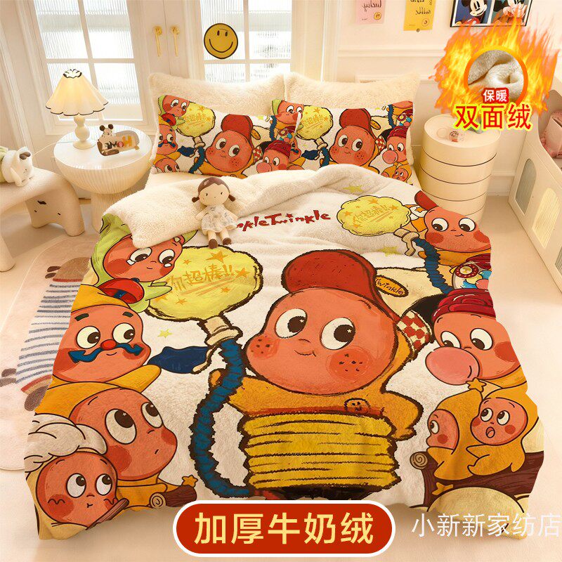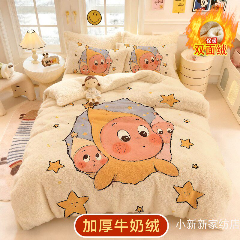冬季星星人牛奶绒四件套儿童卡通被套法莱绒床品三件套保暖厚被罩