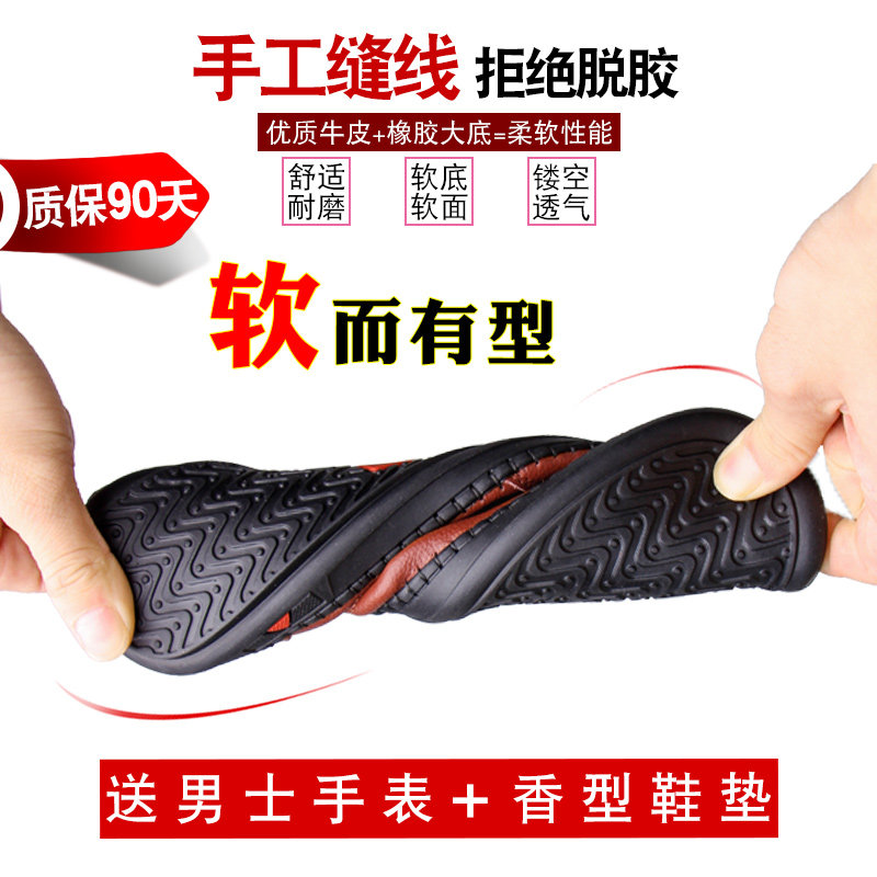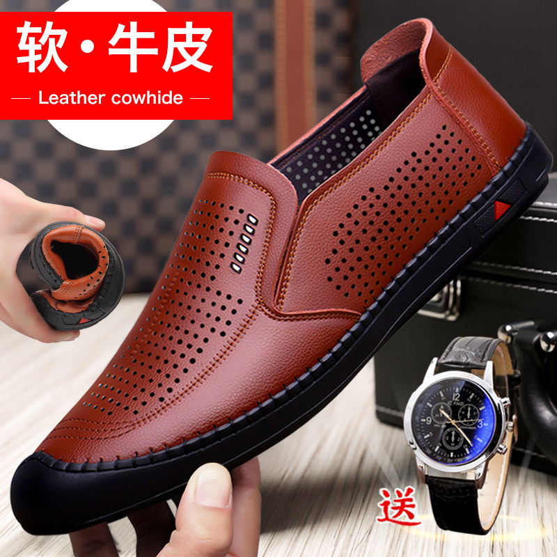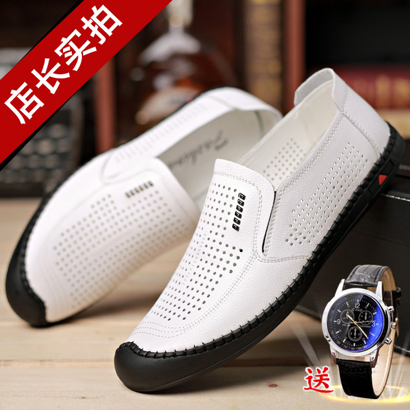 男士夏季洞洞凉鞋休闲皮鞋真皮白色透气新款软底青年镂空潮流男鞋