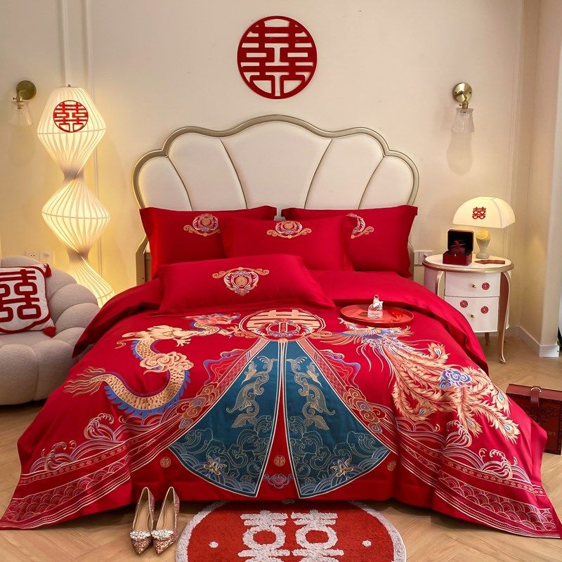 高级感中式结婚四件套红色床单龙凤刺绣被套喜被婚庆床上用品