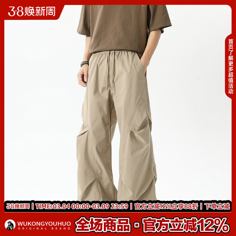悟空有货美式街头褶皱设计运动裤男潮牌宽松工装长裤透气休闲裤薄