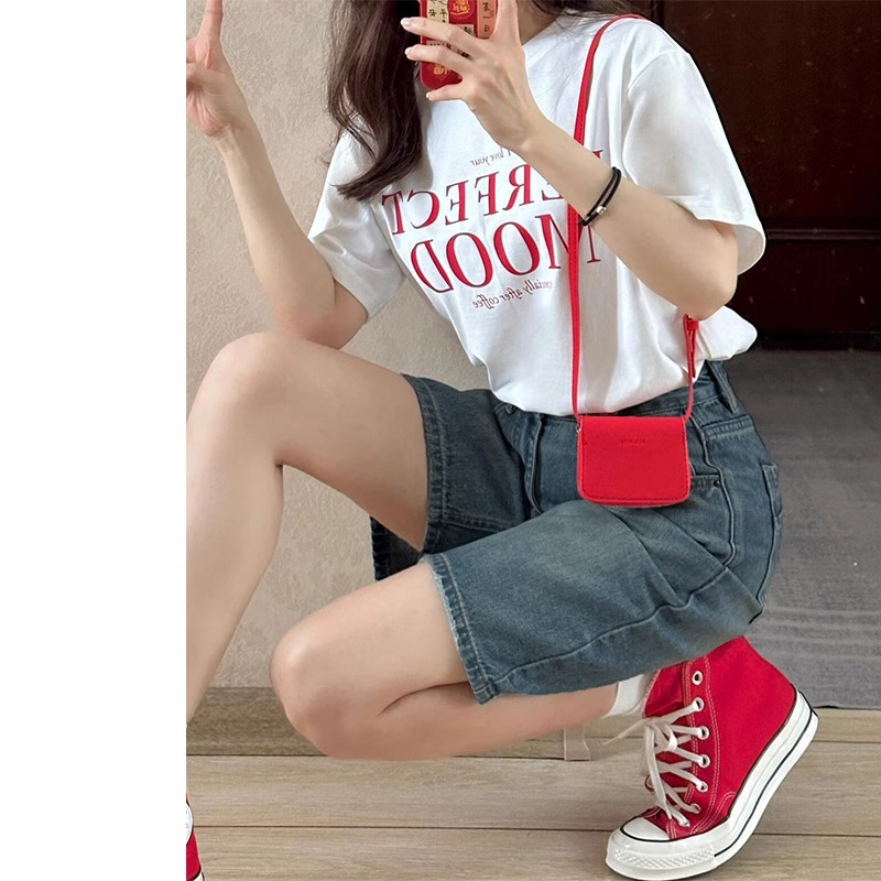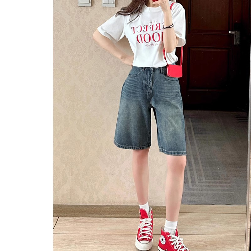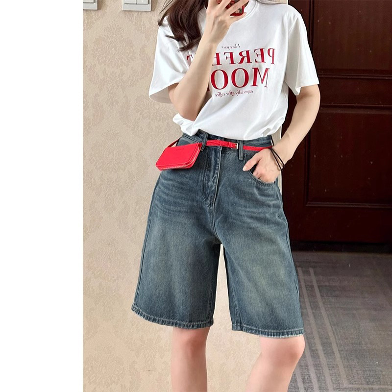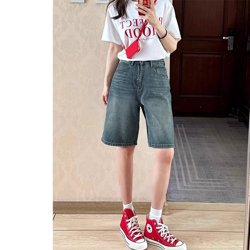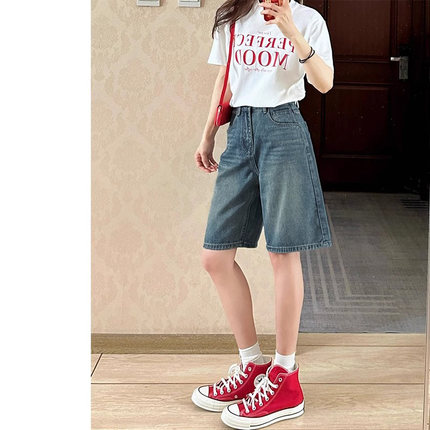 大码复古蓝直筒牛仔中裤女夏季新款高腰宽松休闲百搭阔腿五分裤子