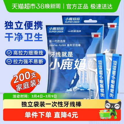 小鹿妈妈100支*2袋独立包装牙线棒超细便携后牙清洁耐磨清洁牙缝
