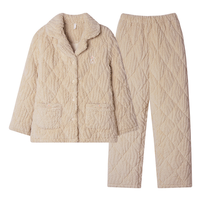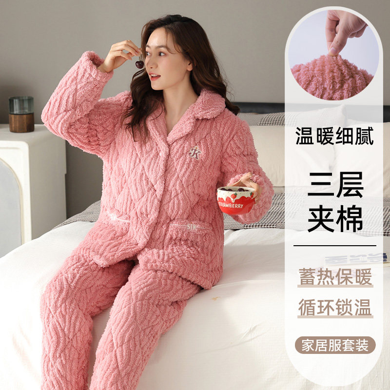 冬季珊瑚绒夹棉睡衣女款2025新款三层家居服中年妈妈大码加绒加厚