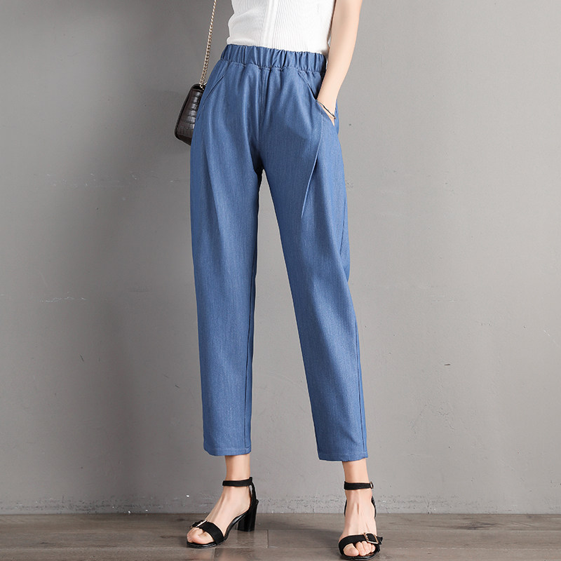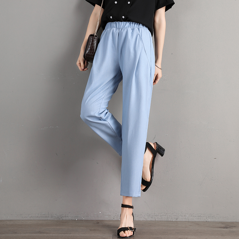 夏季薄款天丝牛仔裤女超薄松紧腰九分冰丝哈伦裤宽松八分女裤子夏