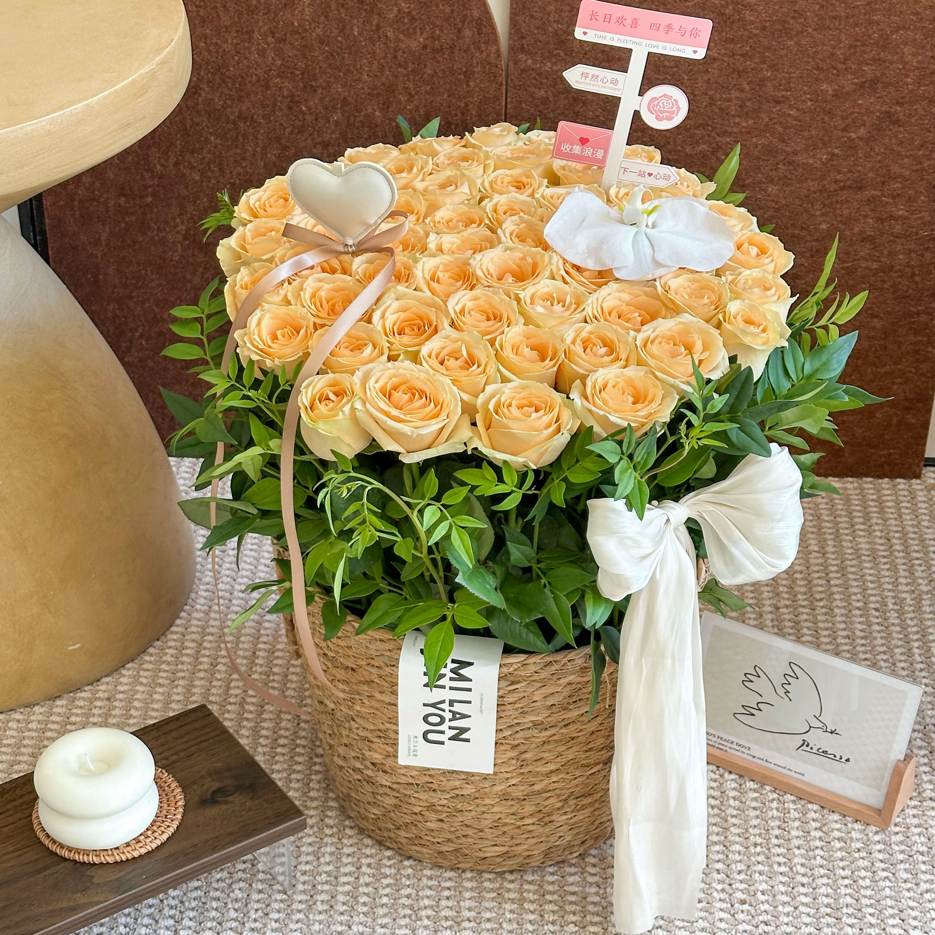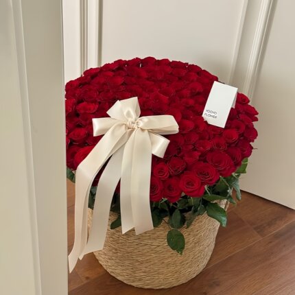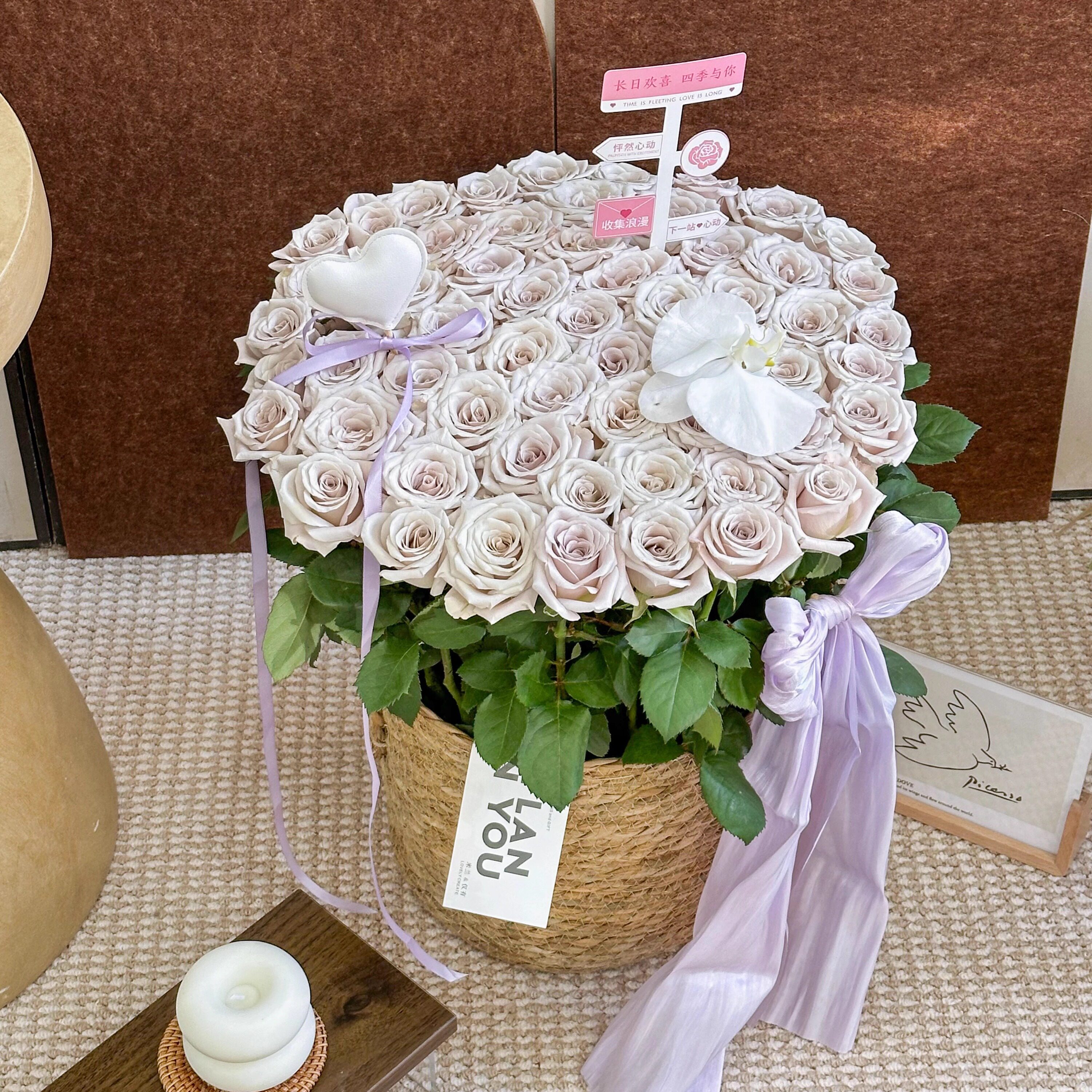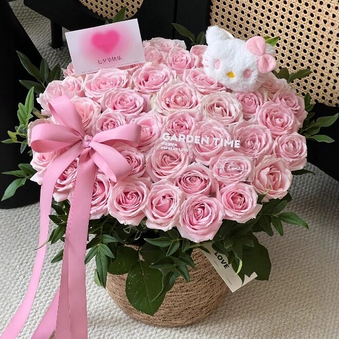 新品红玫瑰草编花篮鲜花包装