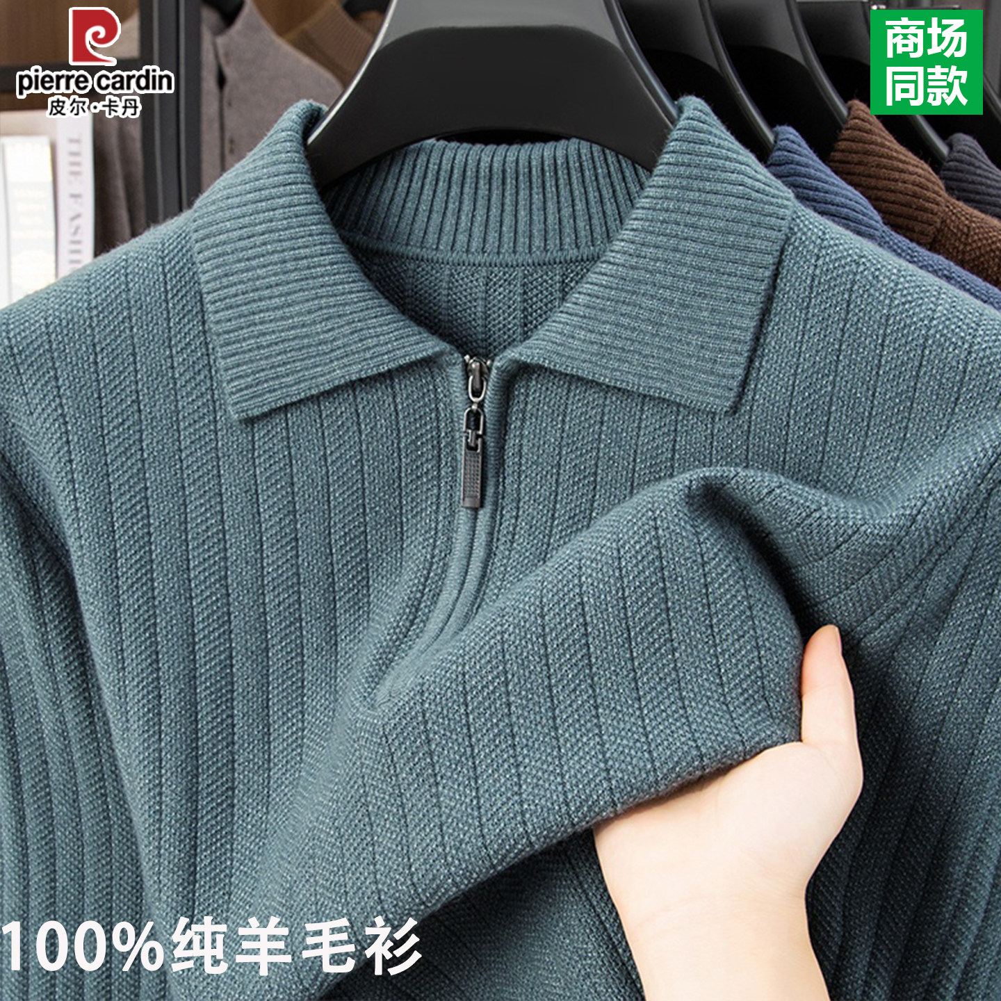 皮尔卡丹100%纯羊毛衫男士半拉链翻领针织衫中年加厚保暖休闲毛衣