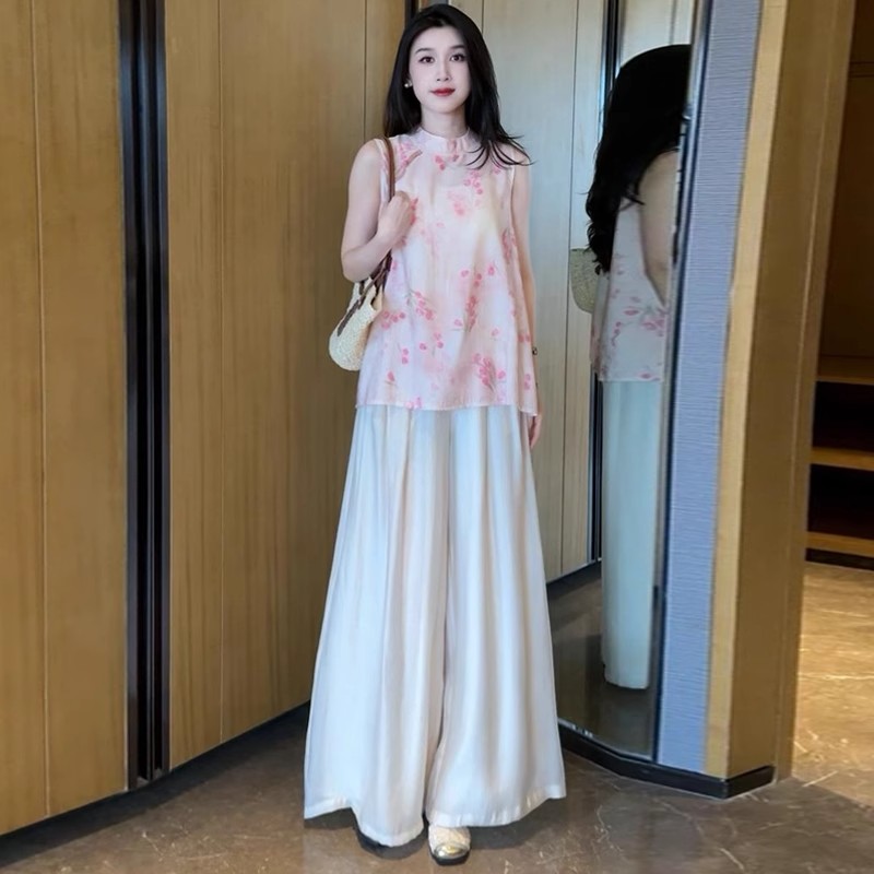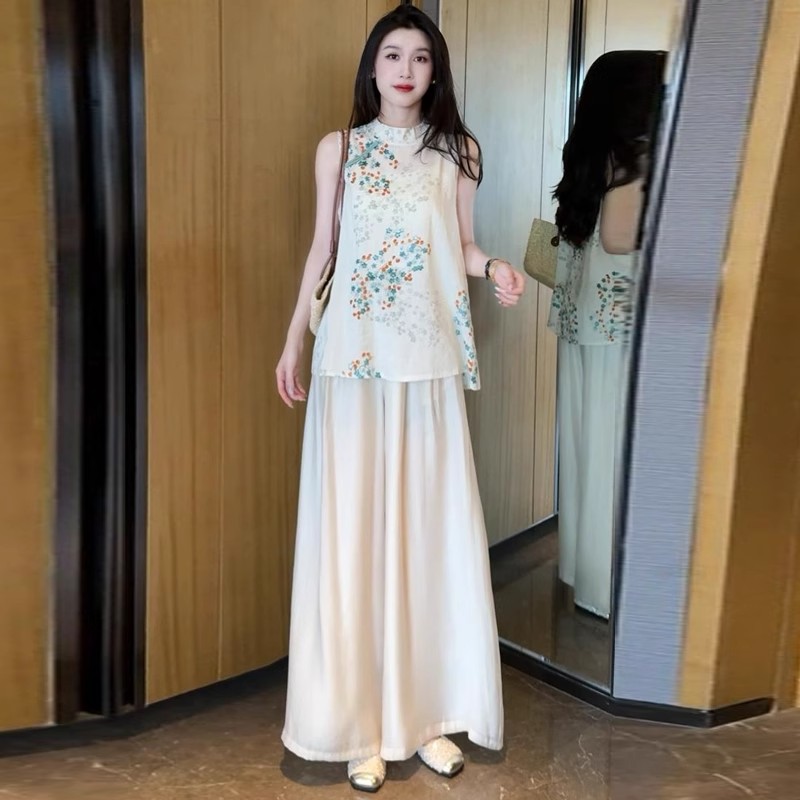 高级感套装女夏季2025新款时尚气质碎花无袖上衣阔腿裤显瘦两件套