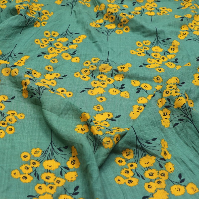 日单复古绿黄花枝花朵纯棉布料夏季连衣裙衣服装上衣衬衫手工面料