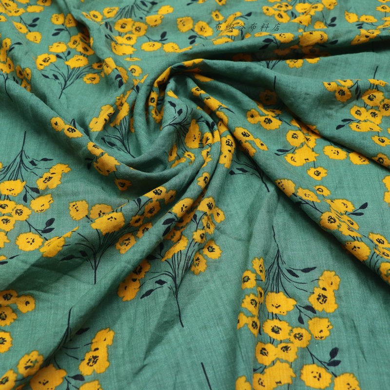 复古绿黄花枝纯棉服装布料